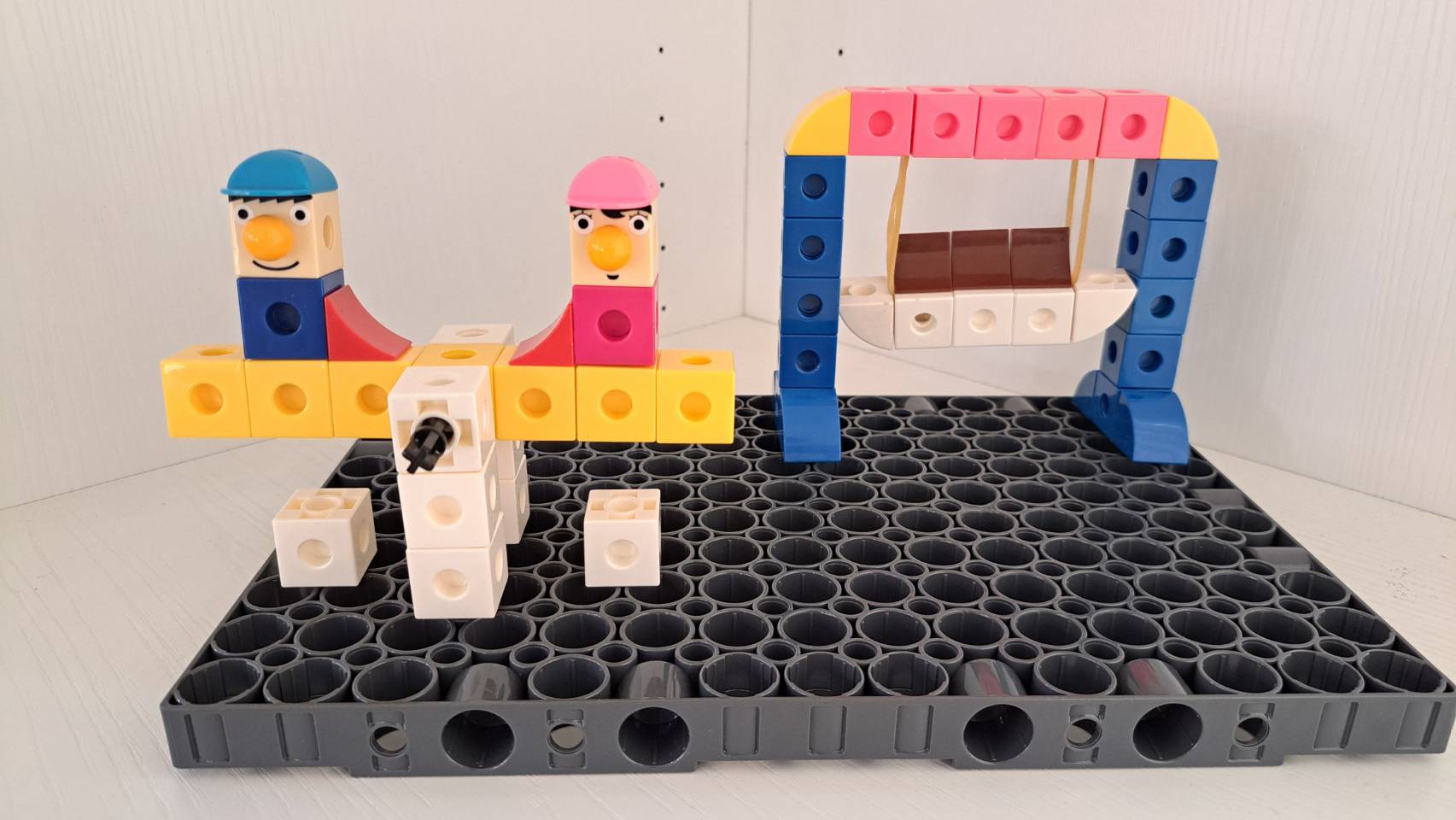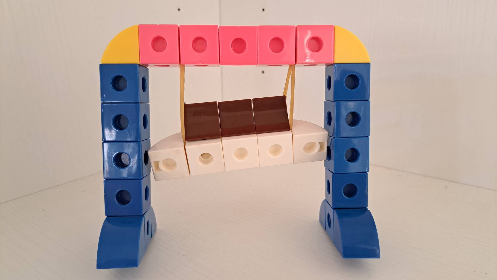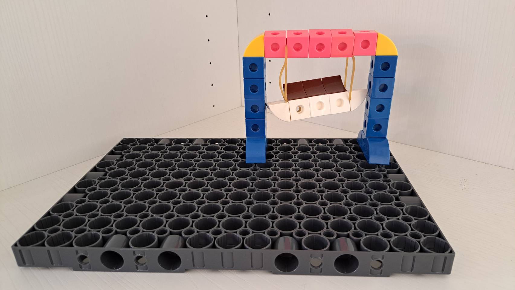 - 要製作一個可以前後擺盪的盪鞦韆,我們可以借用橡皮筋的彈力來完成!在組裝時可以像圖片所示,先將橡皮筋套在凸點上,再用另一側的積木將其固定。