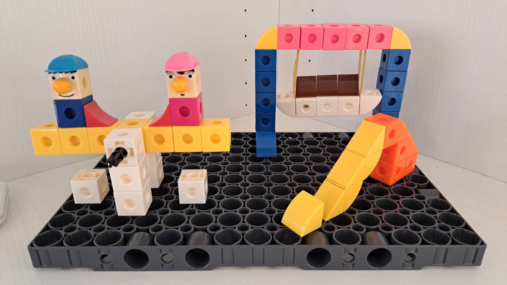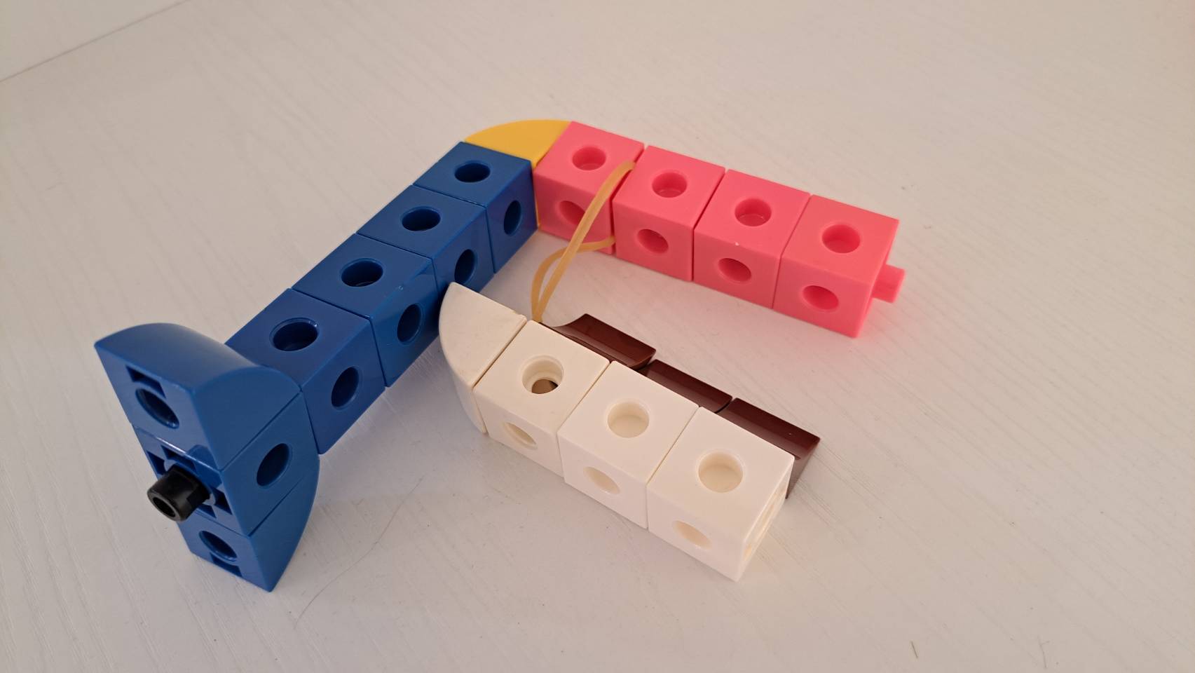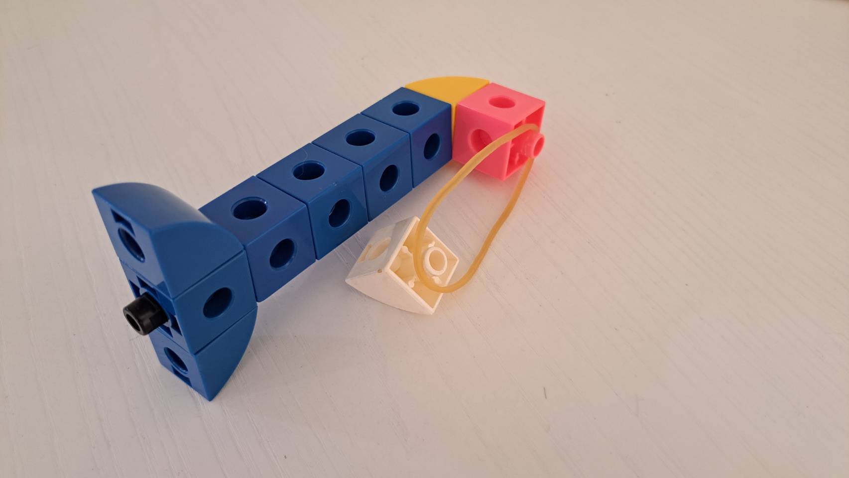 - 要製作一個可以前後擺盪的盪鞦韆,我們可以借用橡皮筋的彈力來完成!在組裝時可以像圖片所示,先將橡皮筋套在凸點上,再用另一側的積木將其固定。