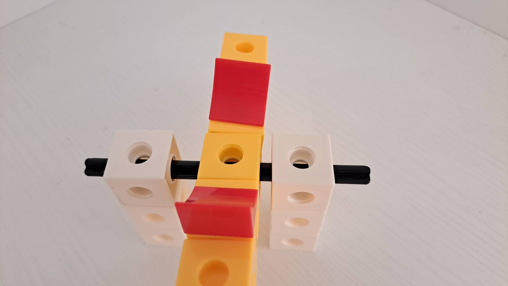- 為了實現翹翹板的旋轉功能,我們使用軸來連接積木,這邊要注意的是軸僅能穿過六凹顆粒,一般的正方顆粒是無法穿過的喔!