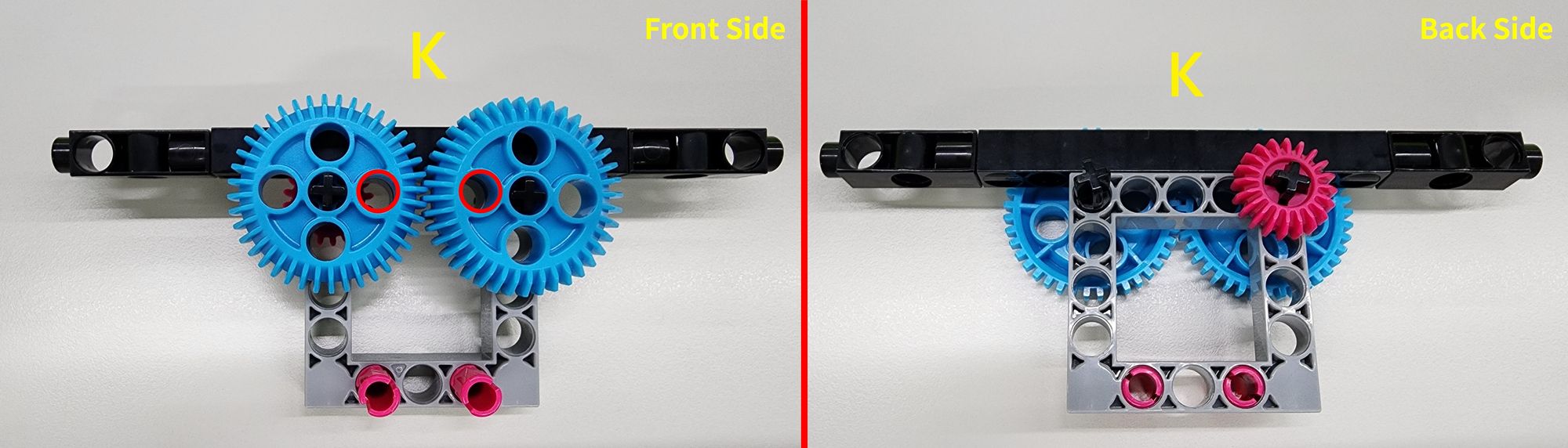 In this step, we will construct the wing base using a C-20T GEAR, two C-40T GEAR WITH HOLE, a C-9 HOLE ROD FRONT CLOSED, a C-3 HOLE DUAL ROD, a C-30mm AXLE Ⅱ, a C-5×5 FRAME II, a C-STATIC AXLE CONNECTOR, and a B-SHORT PEG (Figure 29). Follow the diagram to assemble these components and complete the K Part. During assembly, ensure that the hole positions on both C-40T GEAR WITH HOLE are correctly aligned (Figure 30).