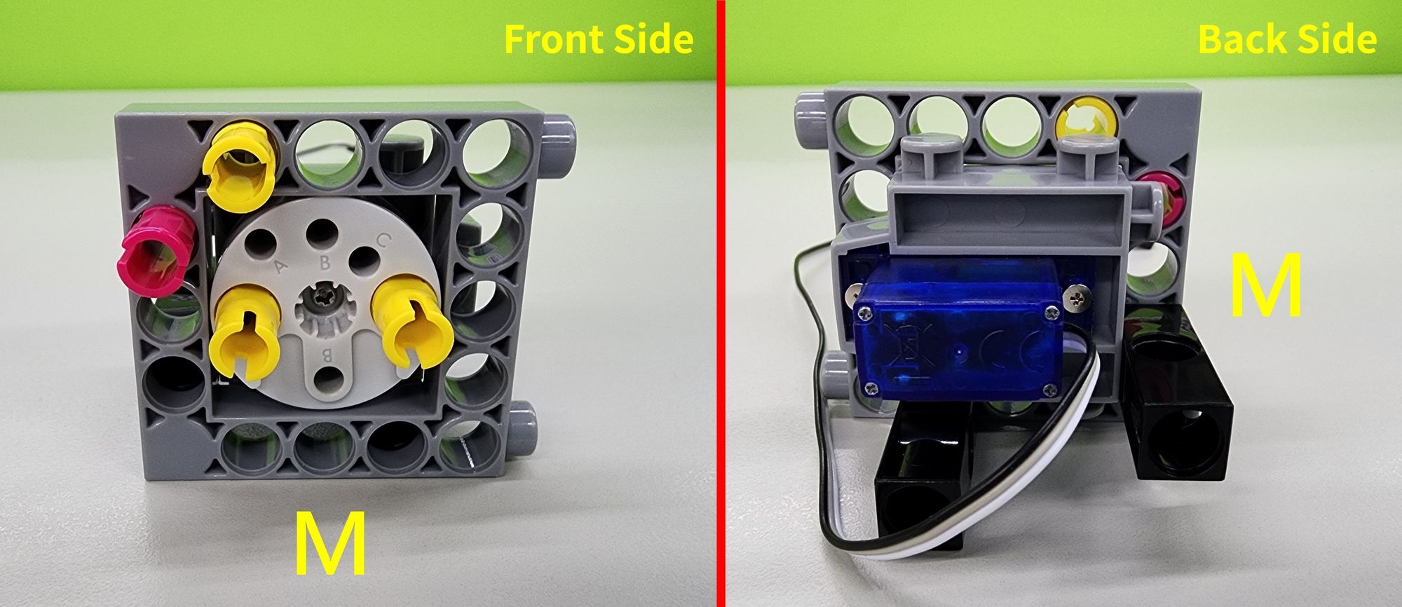 In this step, we will construct the head of the bionic bird using the C-5×5 FRAME II, a C-180° SERVO MOTOR, a C-3 HOLE DUAL ROD, a C-20mm AXLE CONNECTOR, and a C-STATIC AXLE CONNECTOR (Figure 38). Follow the diagram to assemble the components and complete the Part M (Figure 39).