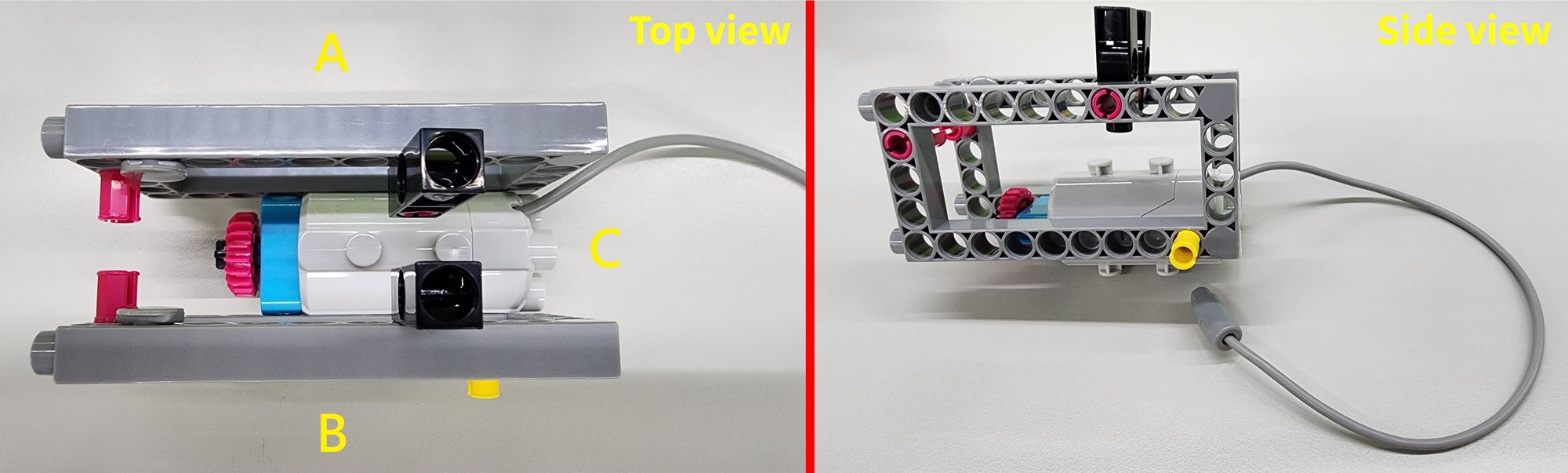 In this step, we will install the motor that drives the wings. The required components include a C-5×5 FRAME II, a C-20T GEAR, a C-35mm AXLE Ⅱ, a C-30mm AXLE Ⅱ, a B-SHORT PEG, and a C-50X PLANETARY GEARBOX (Figure 32).