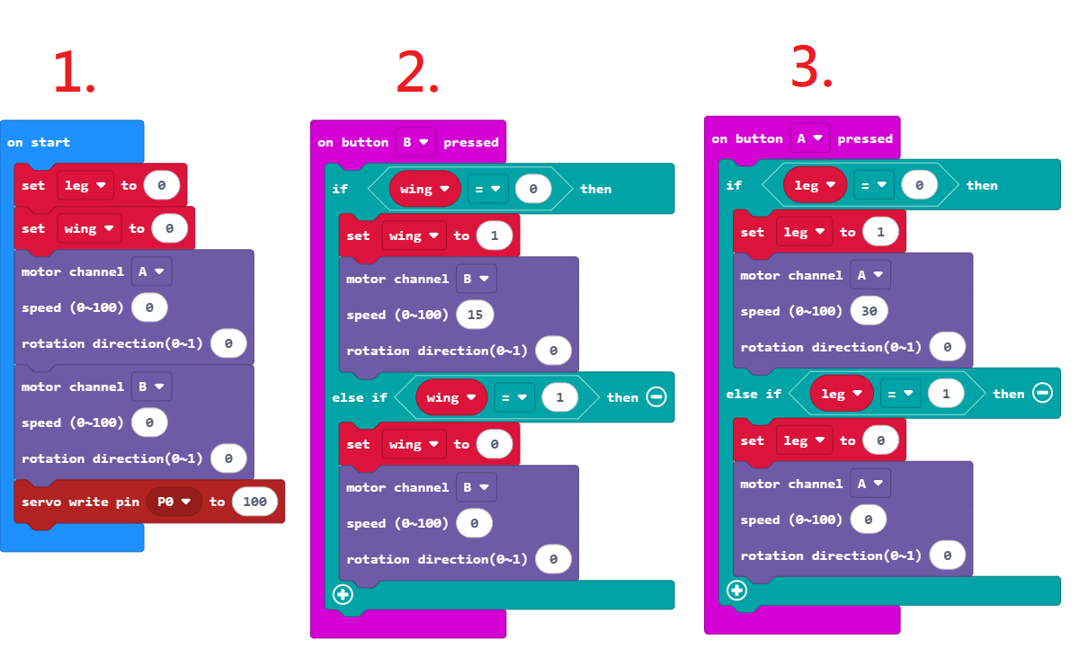- Pressing Button B activates the bird’s wings. The wing variable is set to 1, and Motor B begins rotating at a power of 15, causing the wings to flap. Pressing Button B again resets the wing variable to 0 and stops Motor B, causing the wings to stop flapping.