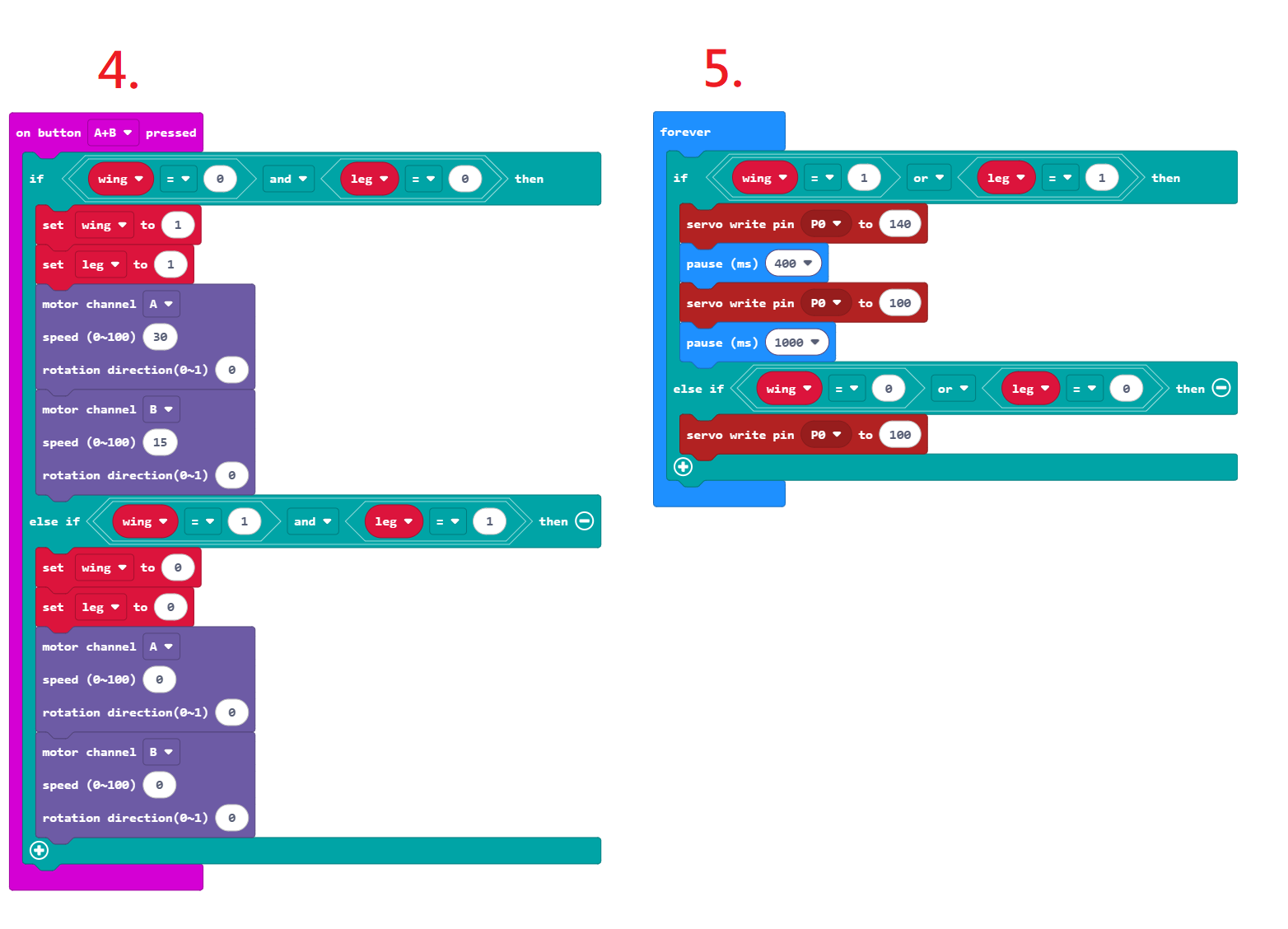 4. Pressing both Button A and Button B at the same time activates both the wings and legs of the bionic bird. The wing and leg variables are set to 1, Motor A runs at a power of 30, and Motor B runs at a power of 15. This causes the bird to move both its wings and legs simultaneously. Pressing both buttons again resets the variables to 0 and stops both motors, halting all movement.