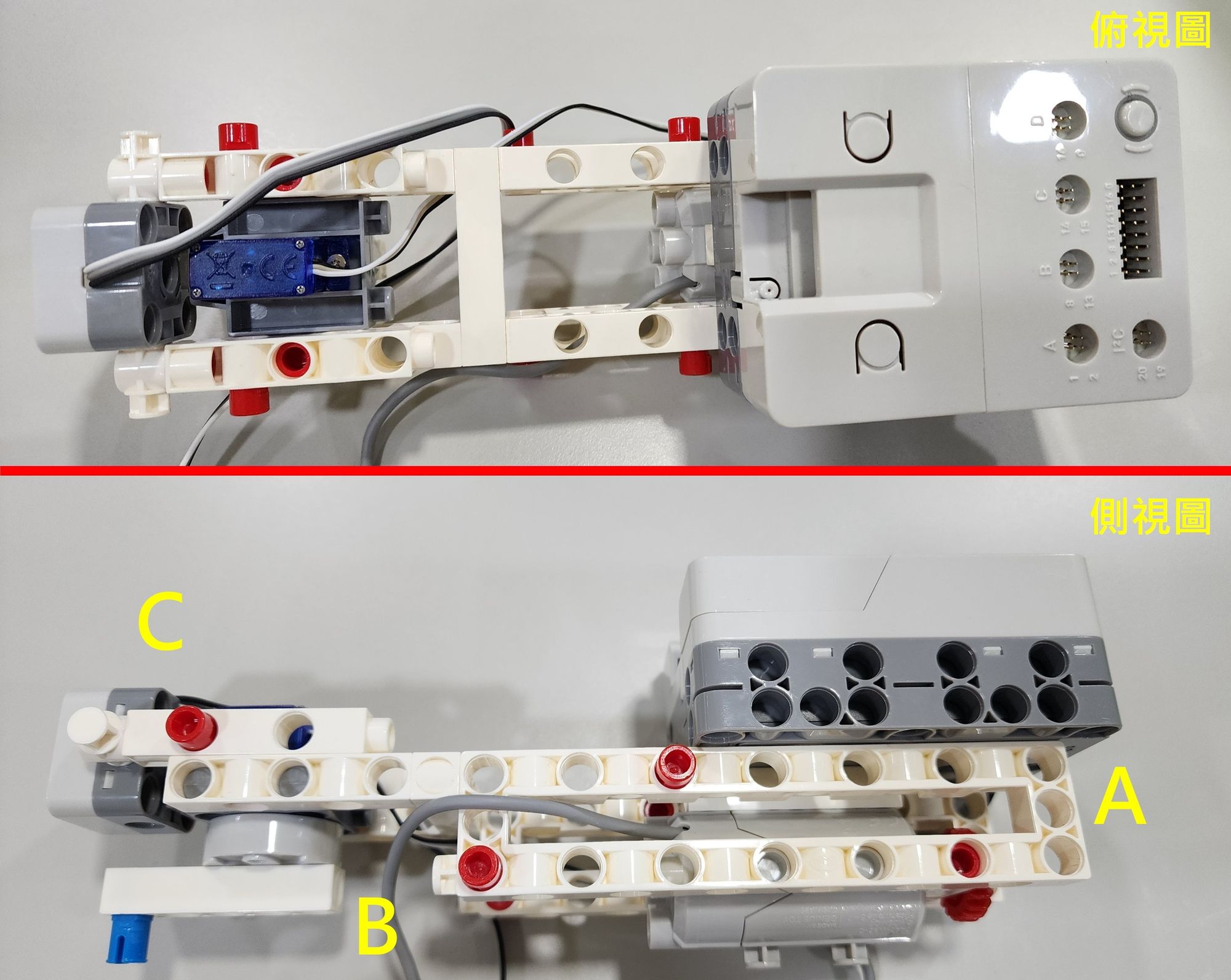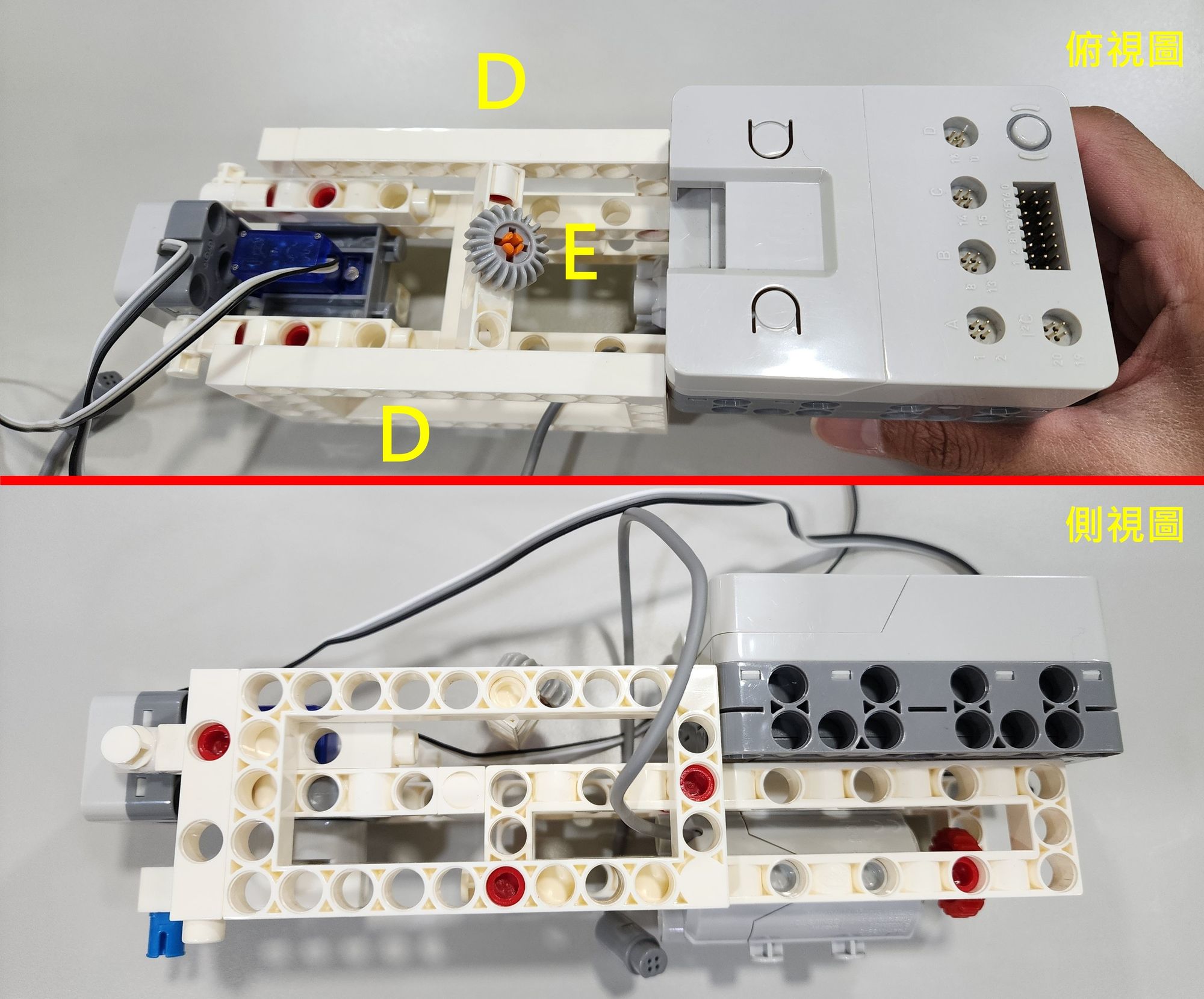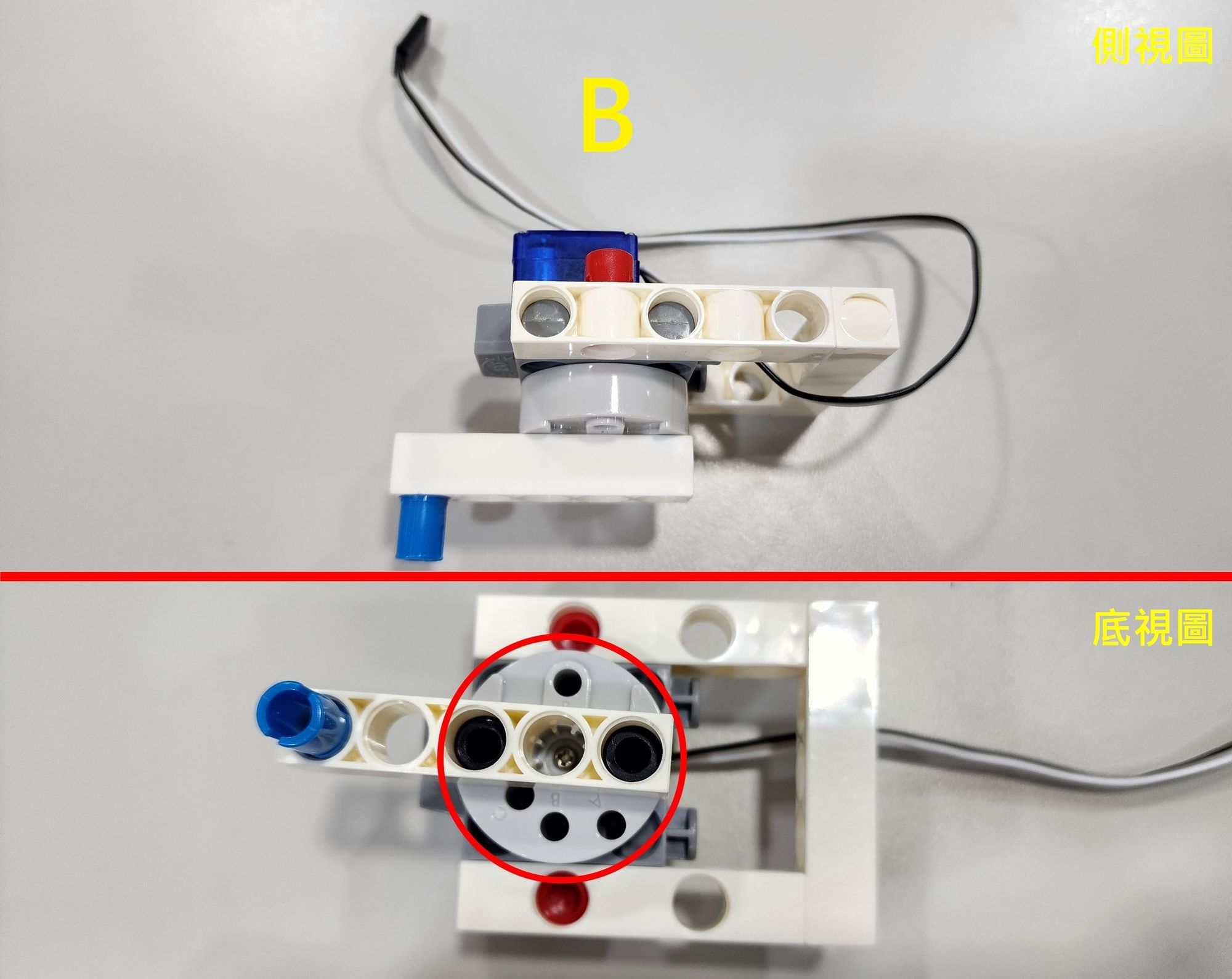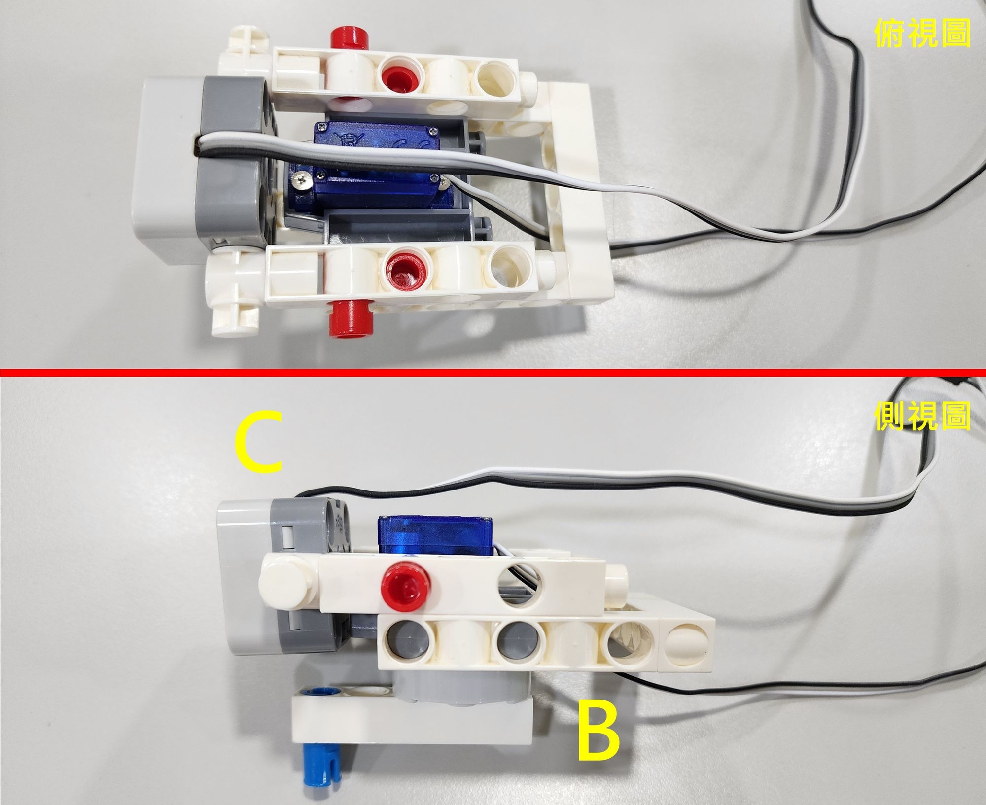 接著將各部件依序結合,完成部件B的製作(圖十),同樣需留意零件安裝在180度角度伺服馬達的方向。