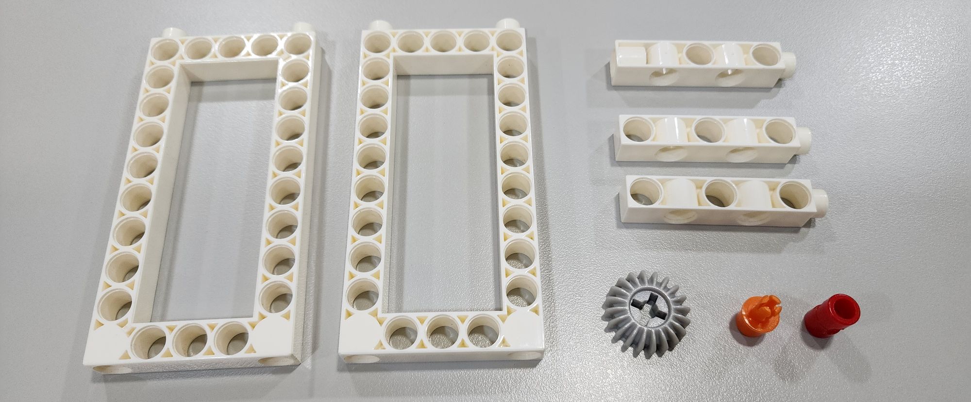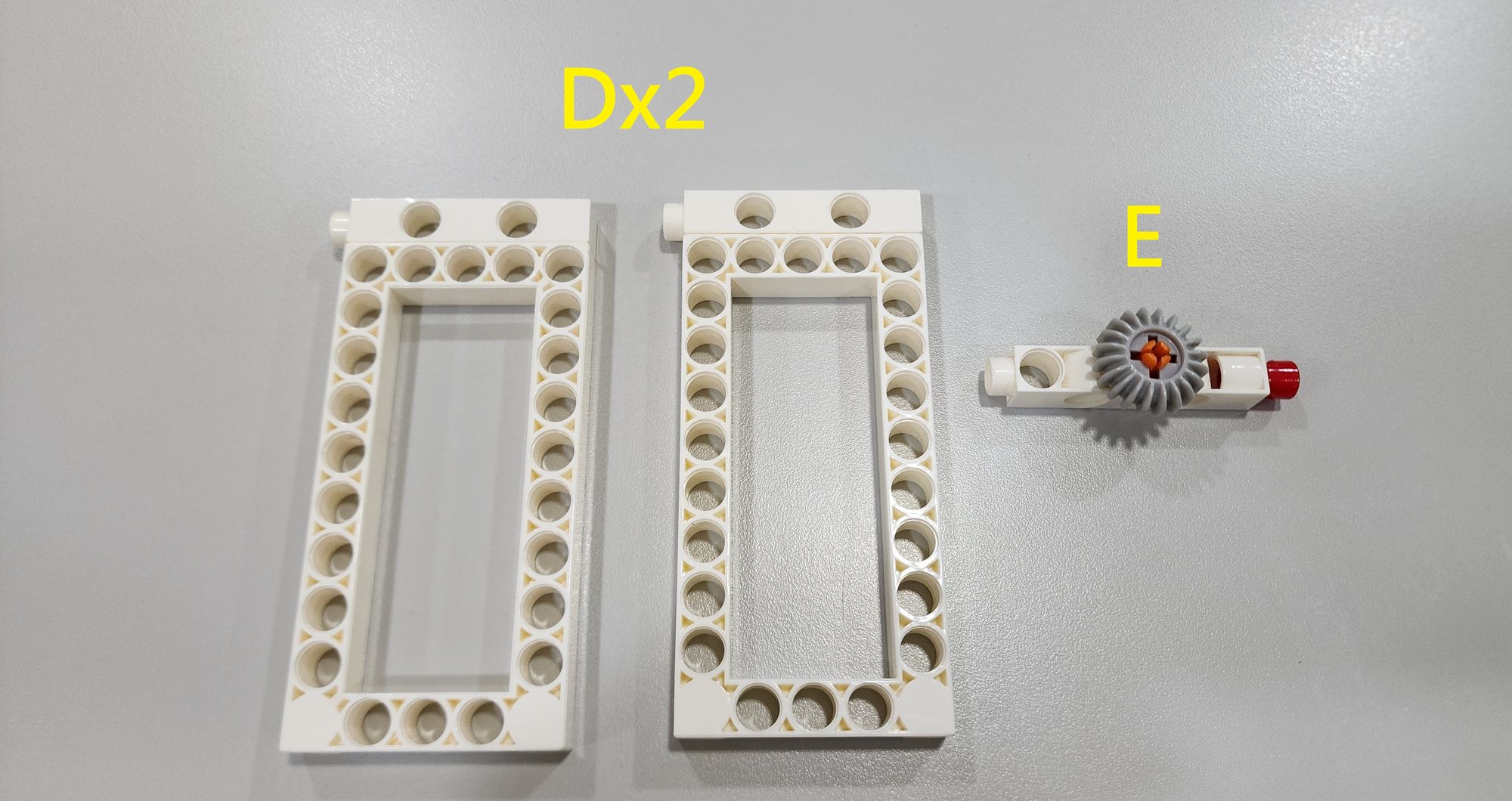 第六步我們要來加固車頭,需要使用到5x10孔長方框、5孔超長條、5孔超長條底無孔、20T齒輪、自轉軸鍵以及長結合鍵(圖十四),將它們依照圖示安裝在一起,完成兩個部件D以及一個部件E(圖十五)。