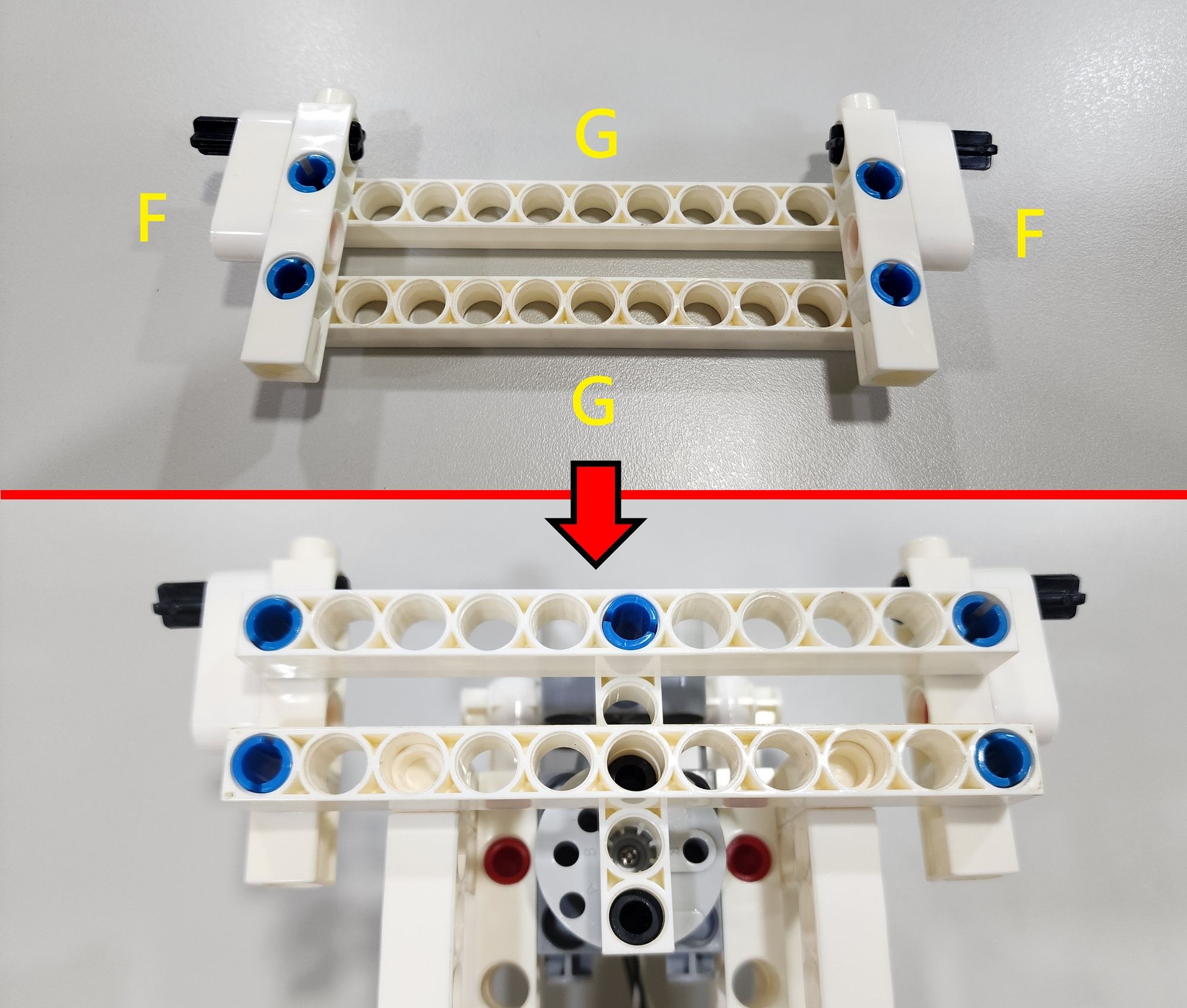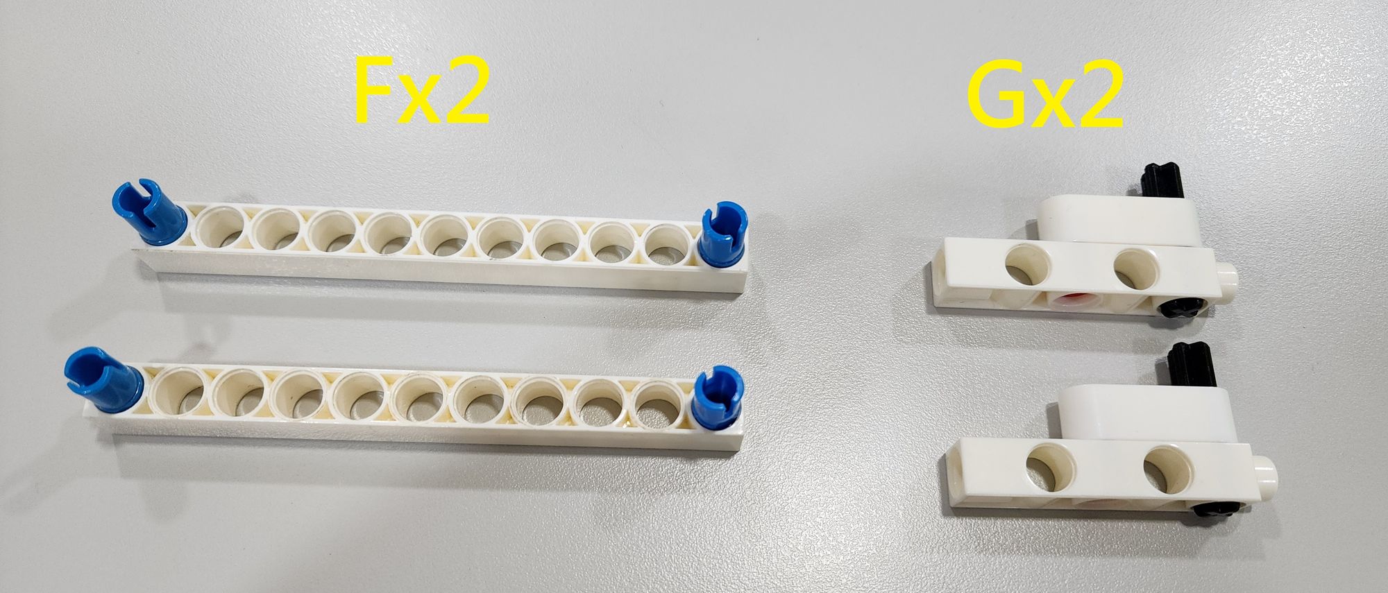 第七步我們要來製作遙控賽車的轉向機構,需要使用到11孔長條、5孔超長條、3孔圓角長條、30mmⅡ軸、軸扣鍵以及長結合鍵(圖十七),依照圖示將它們組裝成兩個部件F以及兩個部件G(圖十八)。