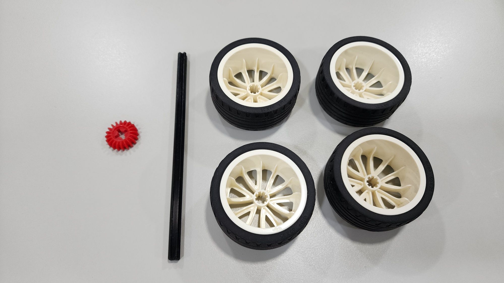 第八步我們要來安裝輪胎,需要使用到20T齒輪、150mmⅠ軸、OD60x25mm塑膠輪框(7407-W10-B1W)以及OD60x25mm橡膠輪胎(7407-W10-A1D)(圖二十),將它們依照圖示安裝在車身前後,完成輪胎的安裝(圖二一)。