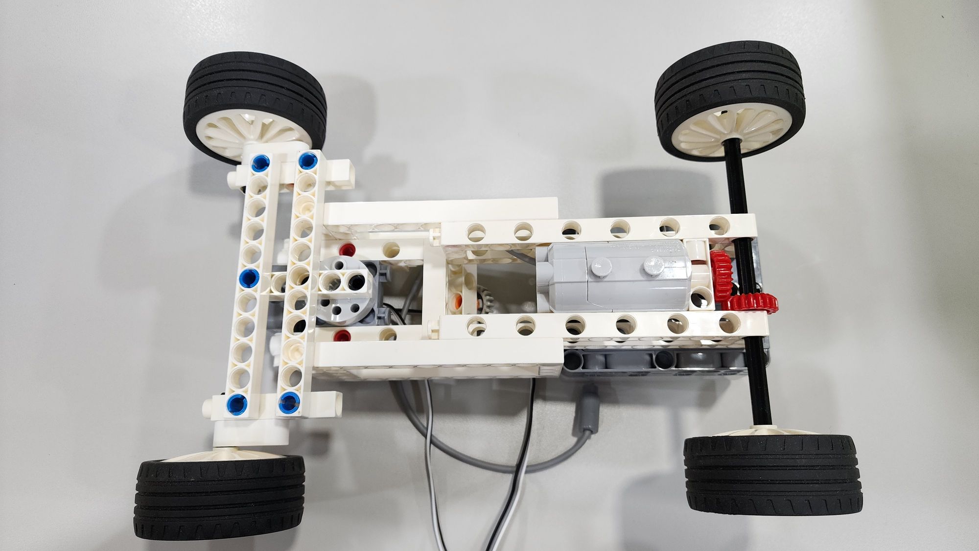 遙控賽車的前輪使用到平行連桿的結構,平行連桿由多個連桿以及可活動的轉軸組成,透過兩對連桿始終保持平行的特性(影片五),讓前方的兩顆輪胎都能保持相同的角度,此外兩顆前輪能夠各自以不同的速度旋轉,能夠避免賽車轉彎時產生內輪差,即車輛在轉彎時,內側車輪比外側車輪走的路程短、轉速必須較慢的物理現象(圖四一)。