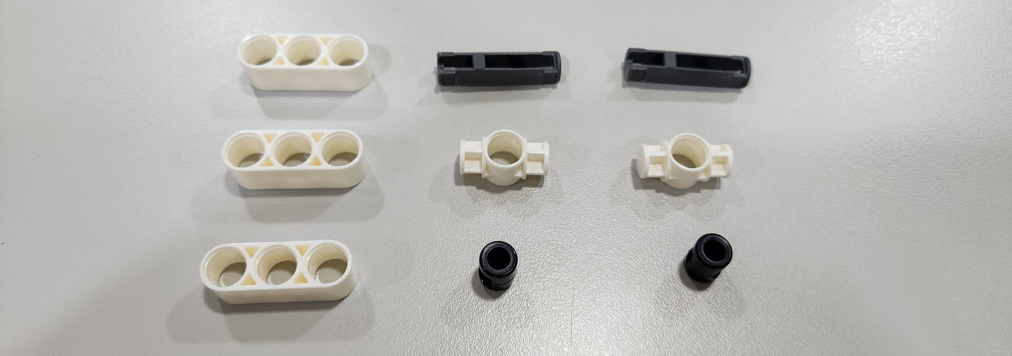 第三步我們要來安裝180度角度伺服馬達,需要使用到180度角度伺服馬達、5孔長條、5孔超長條底無孔、長結合鍵、短結合鍵以及軸扣鍵(圖七),其中要確保180度角度伺服馬達的角度已使用Makecode程式調整至90度,以免遙控賽車在運作時發生失誤,再來依照圖示將零件安裝成好幾個部件(圖八)。