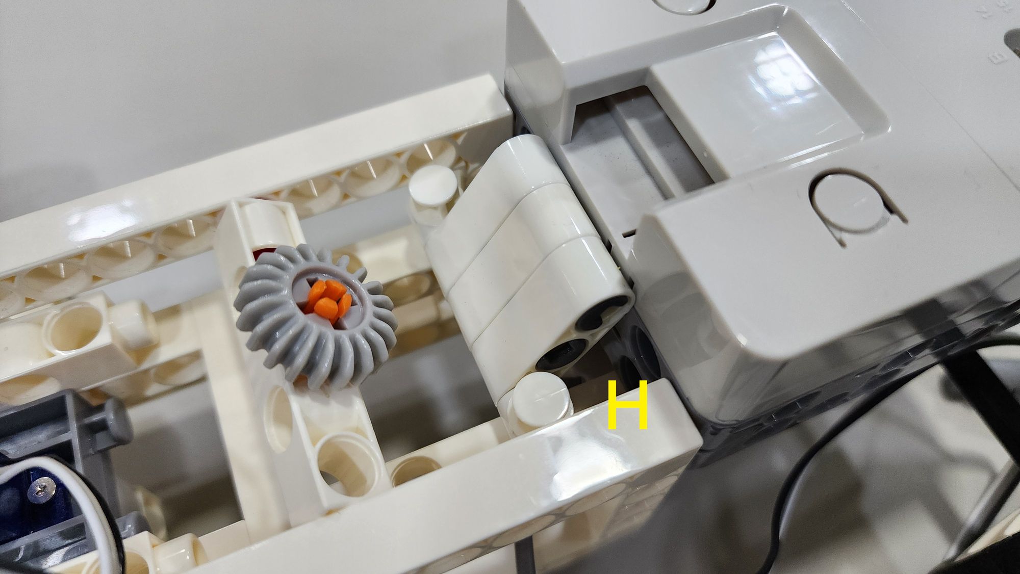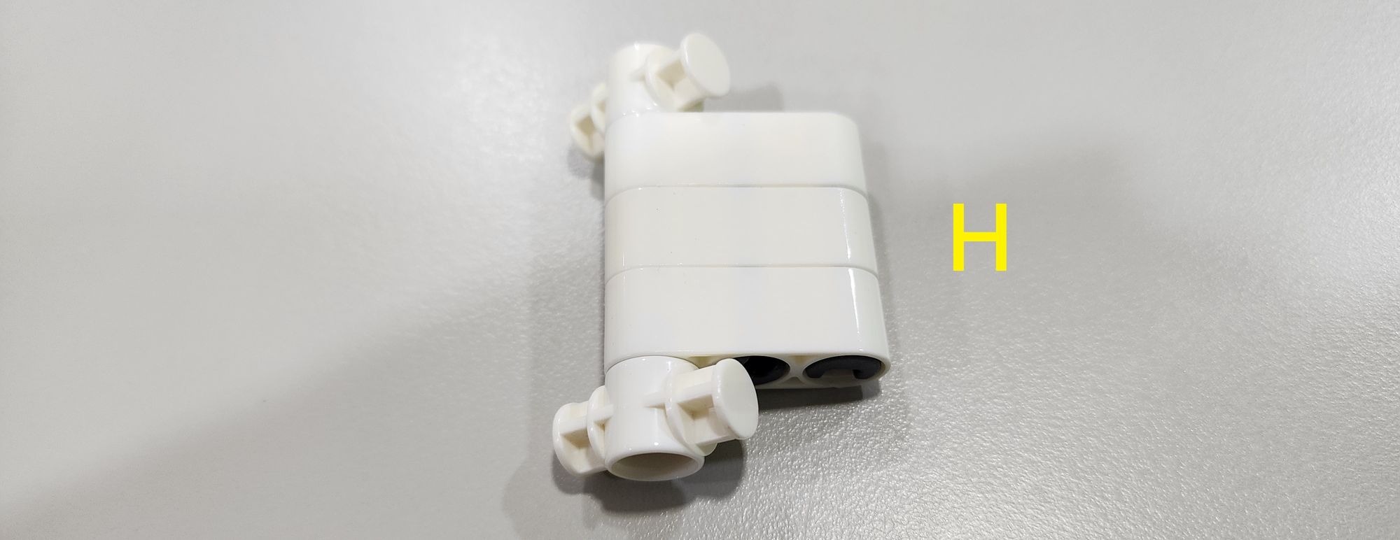 第九步我們要來製作座椅,需要使用到3孔圓角長條、30mm 栓釘鍵、2凸單孔轉向結合器以及短結合鍵(圖二二),依照圖示將它們組裝成部件H(圖二三)。
