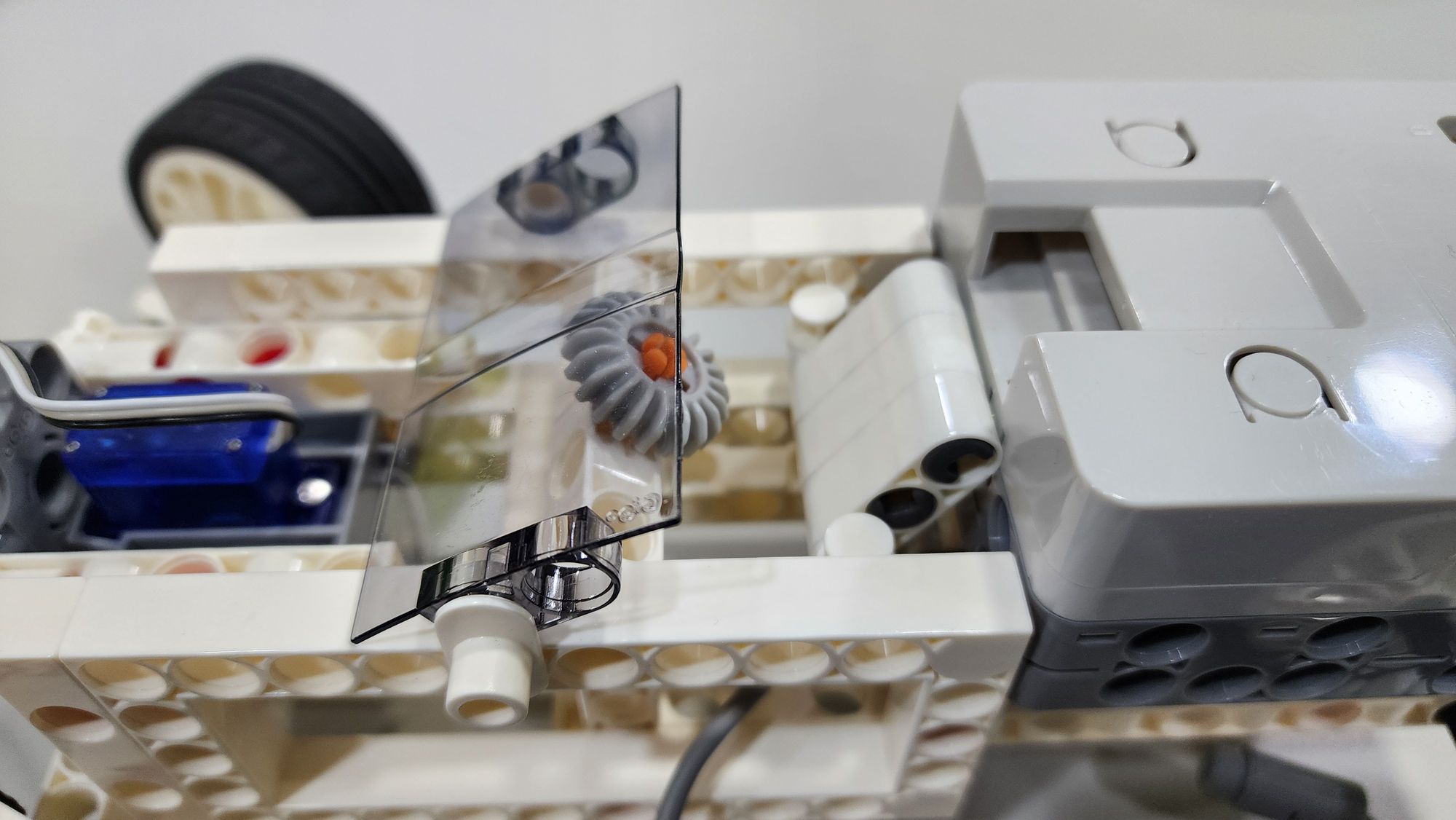 接著依照圖示將部件F以及部件G組裝成平行連桿,並將它與車身以及180度角度伺服馬達結合(圖十九),完成轉向機構的製作。
