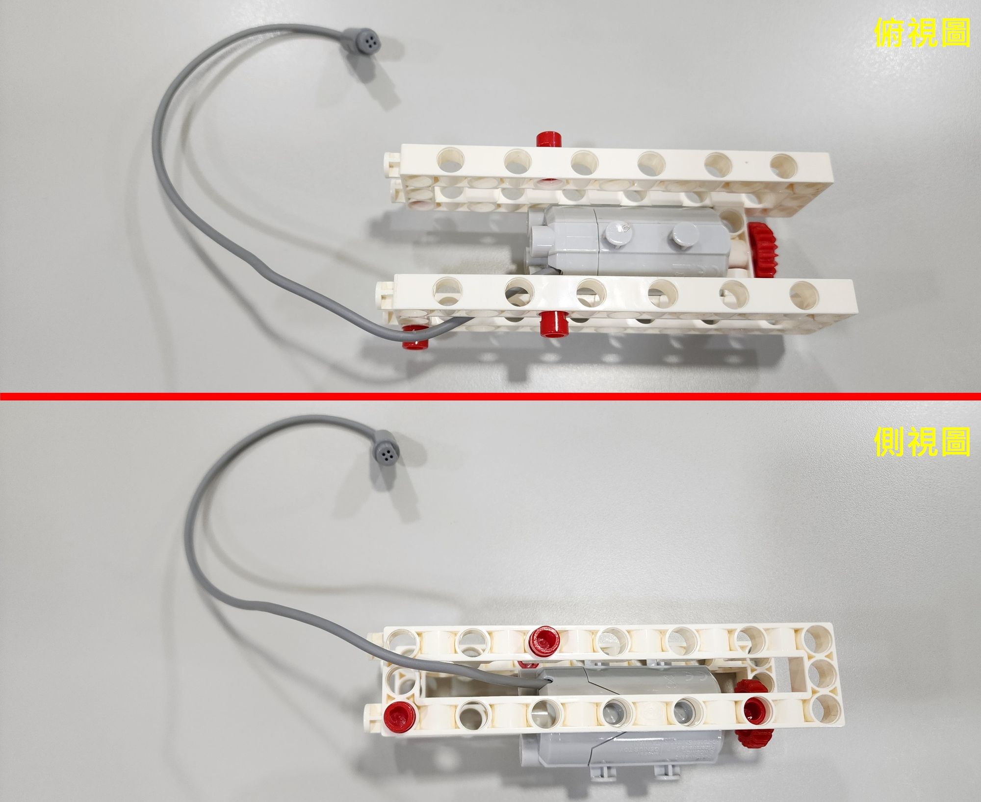 接著將3x13孔超長方框安裝在50倍行星齒輪馬達盒的左右兩側起(圖三),完成車體的結構。
