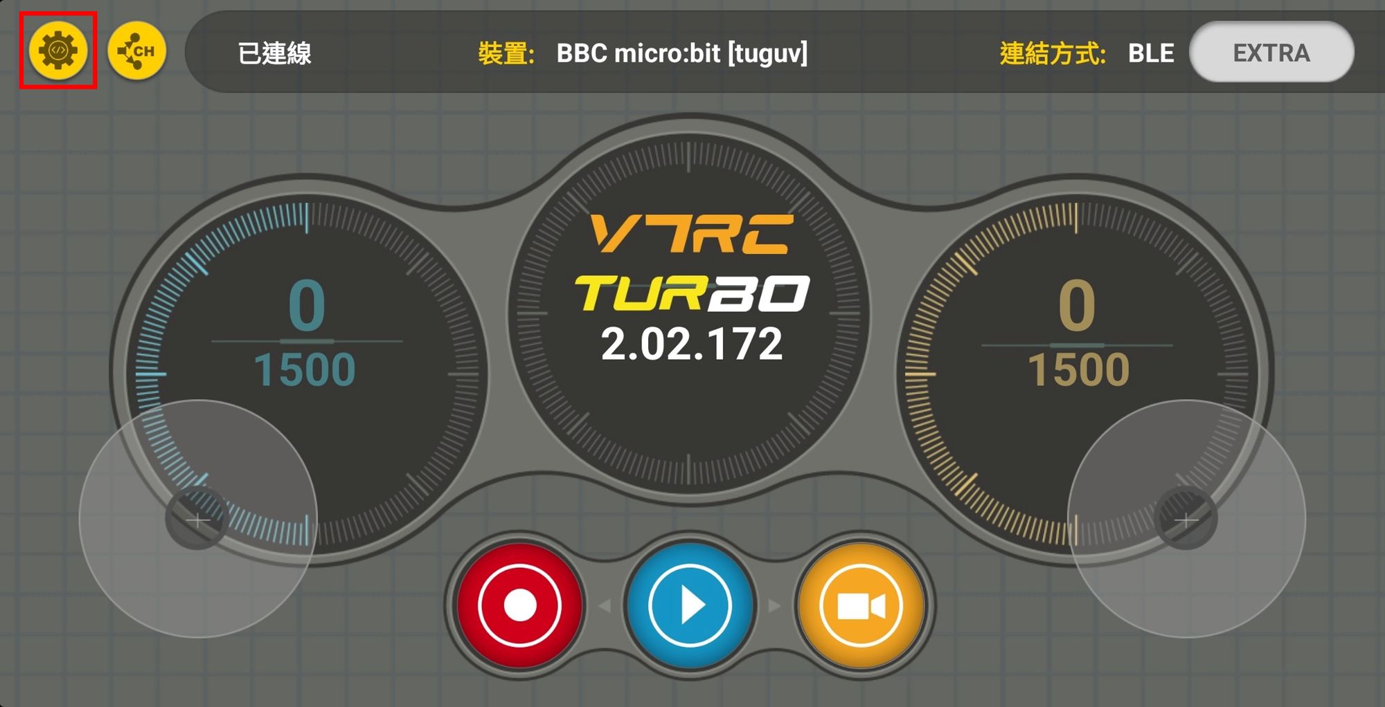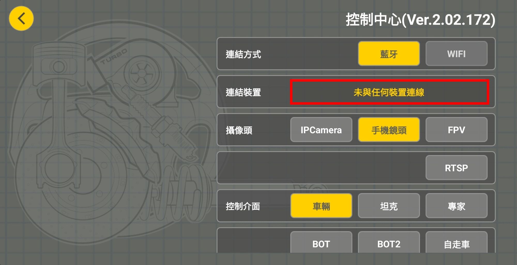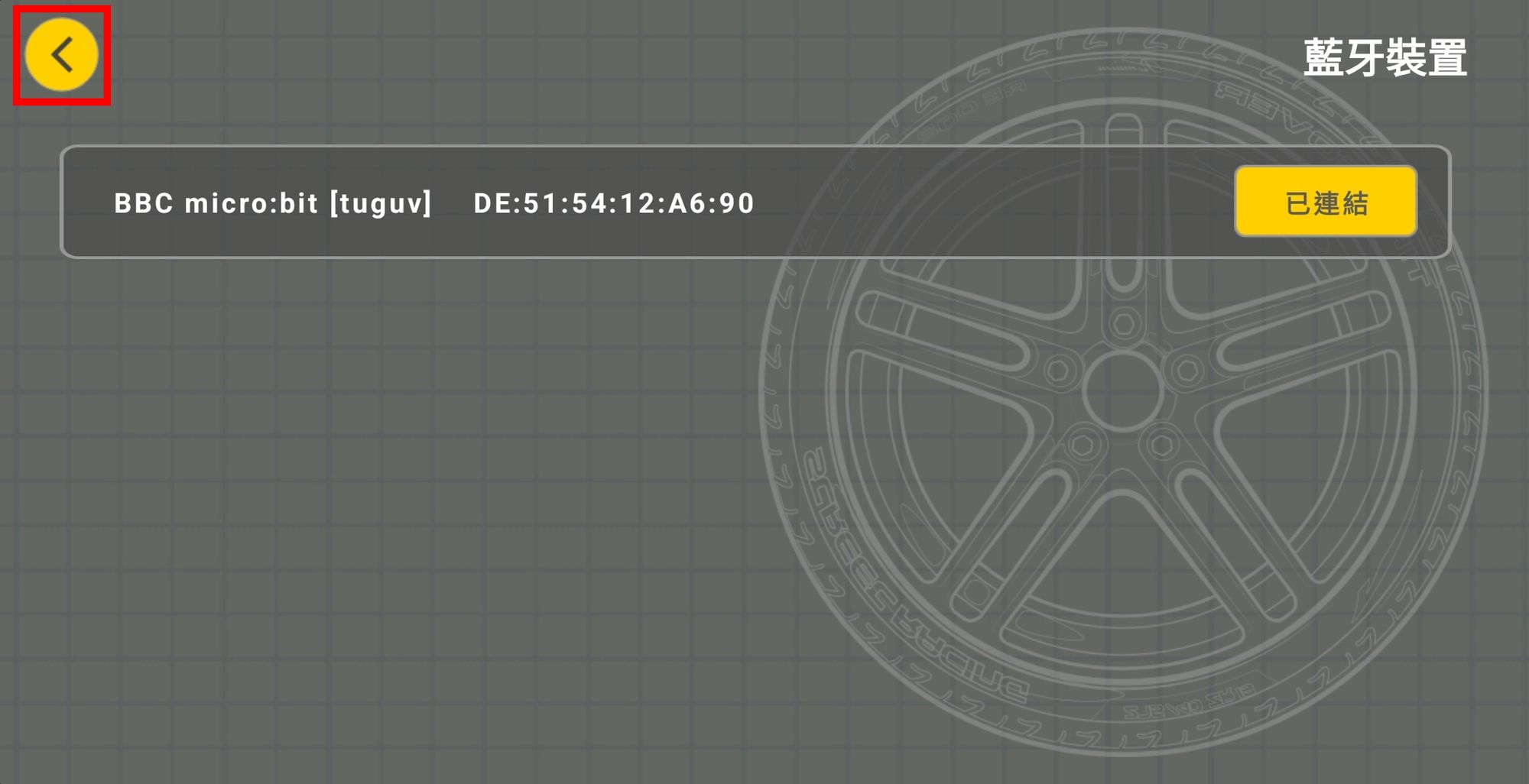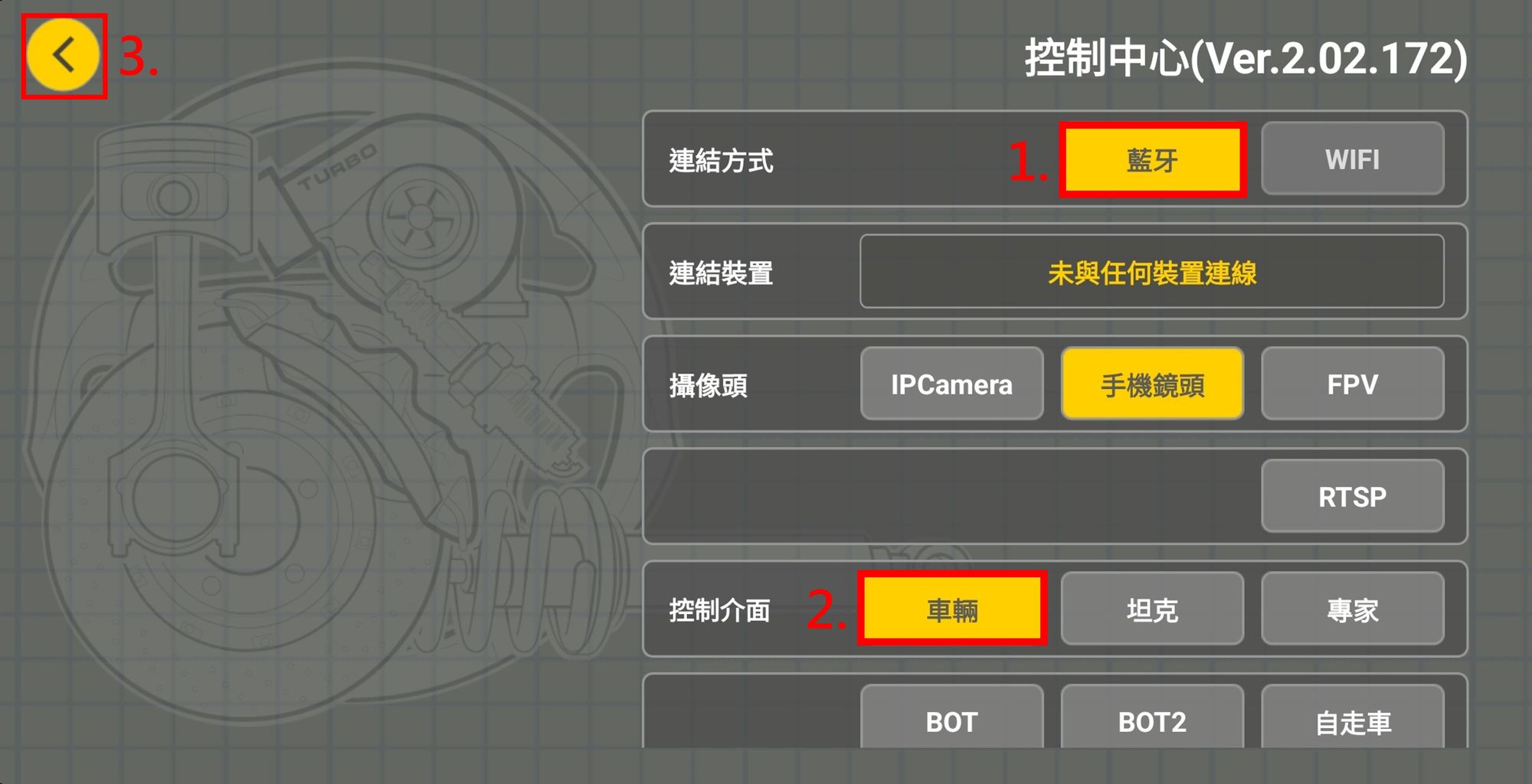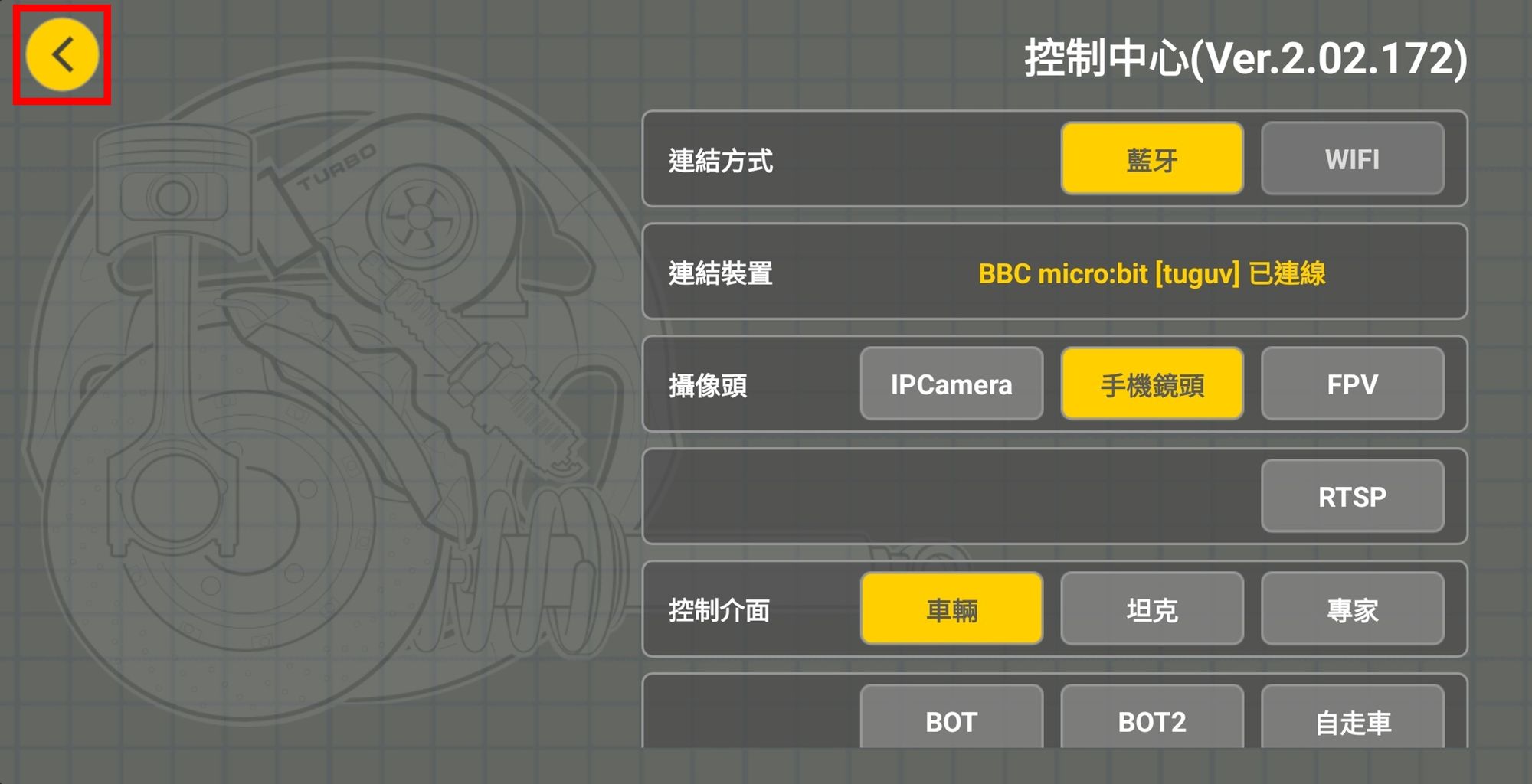 步驟3 將連線方式設定為藍牙、控制介面設定為車輛,完成後點擊返回圖示回到搖桿介面(圖三一)。