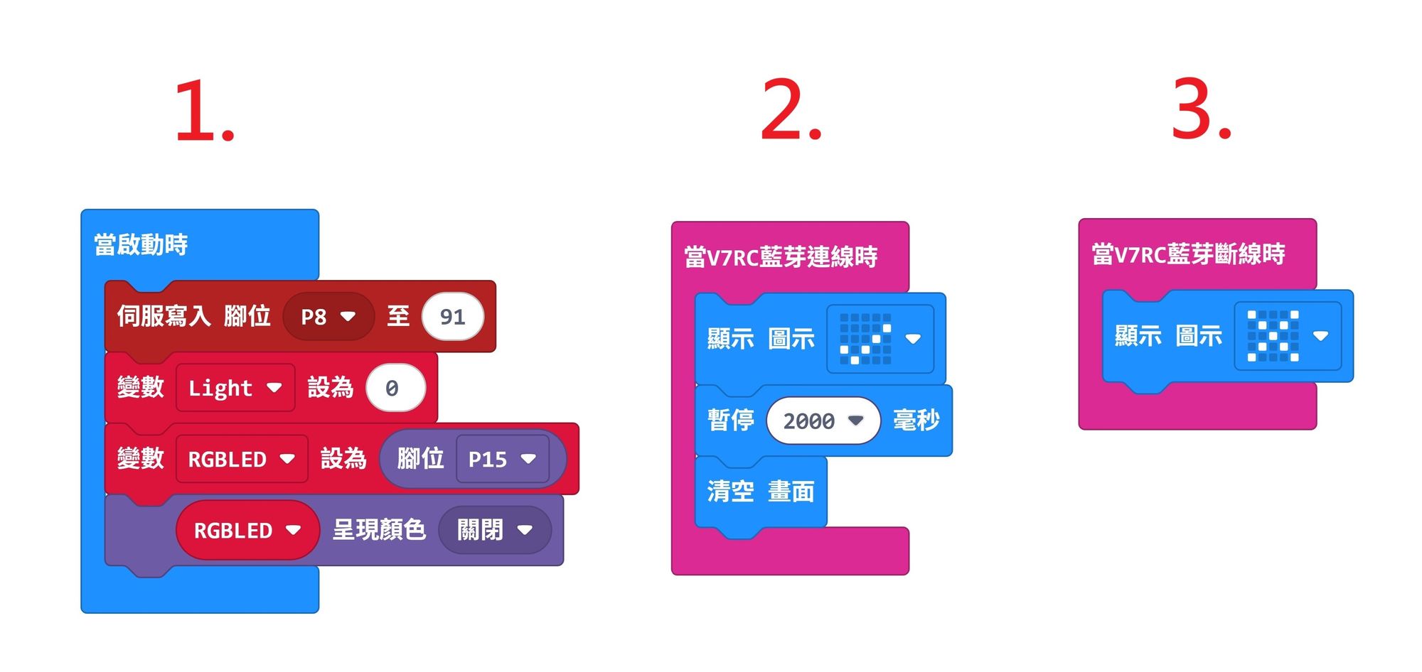 當我們成功匯入後,便能夠看到下面幾段程式方塊(圖三三、三四、三五),相關的程式說明如下: