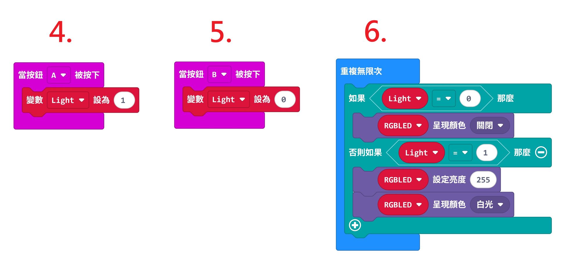 6. ◆當變數Light為1時,點亮多色LED燈座;當變數Light為0時,關閉多色LED燈座。