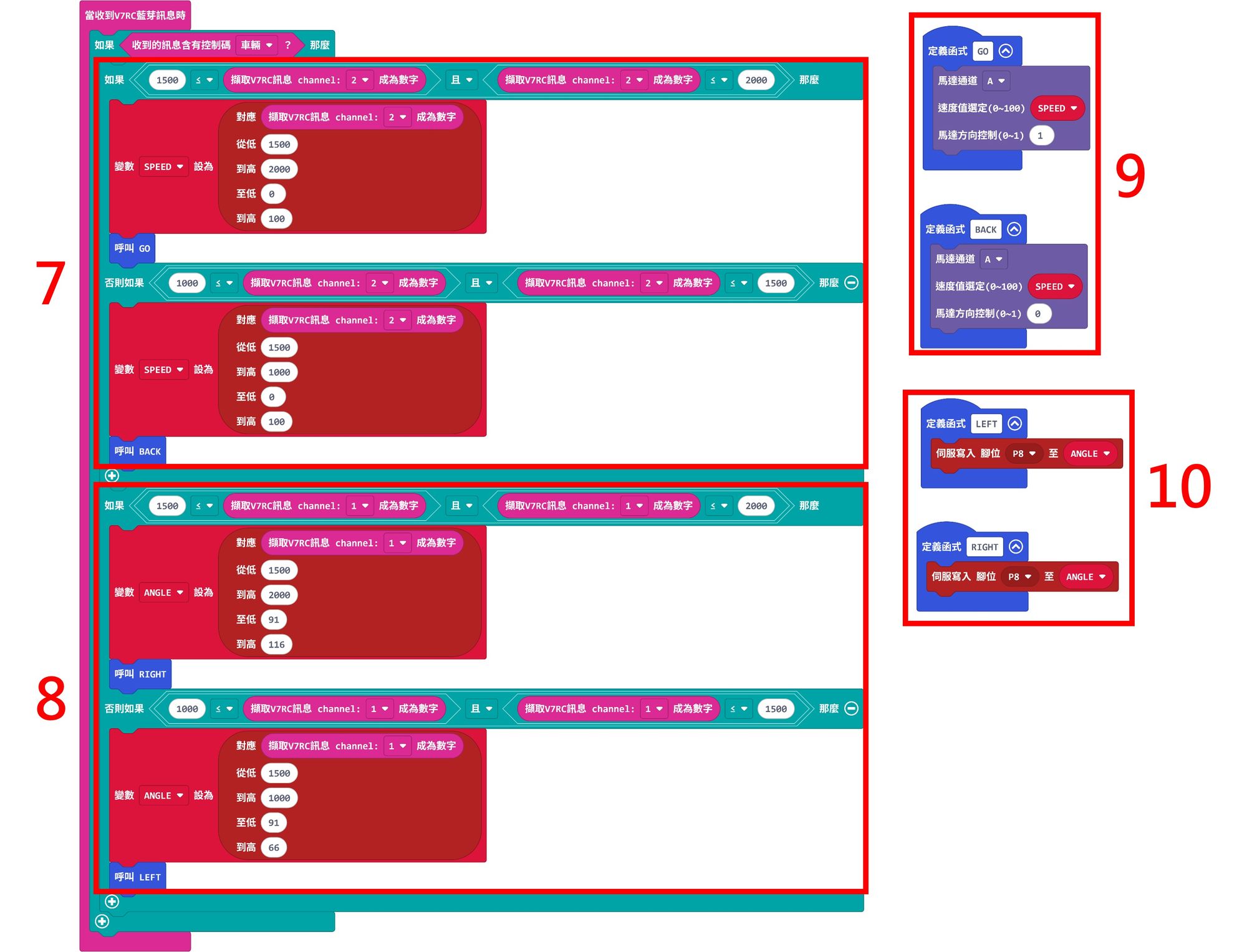 8. ◆當右側搖桿向右推動時(1軸向量介於1500~2000),將變數ANGLE量化為1軸的向量(1軸向量每增加20,變數ANGLE便增加1,這樣便能夠透過右側搖桿來控制賽車前輪的右轉幅度,即右側搖桿向右推動越多,賽車前輪向右轉動的幅度越大,最多轉動25度),並呼叫函式RIGHT。