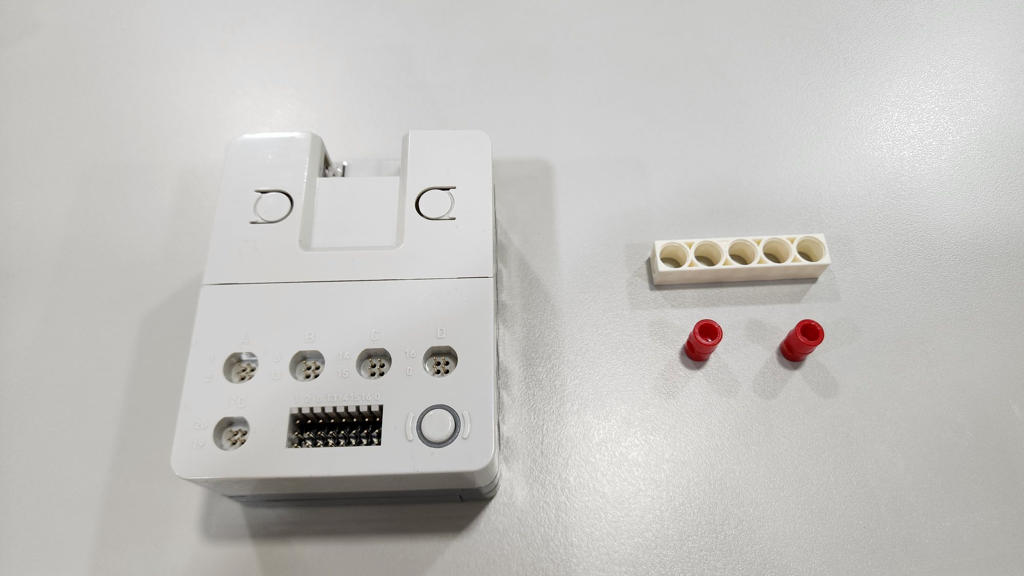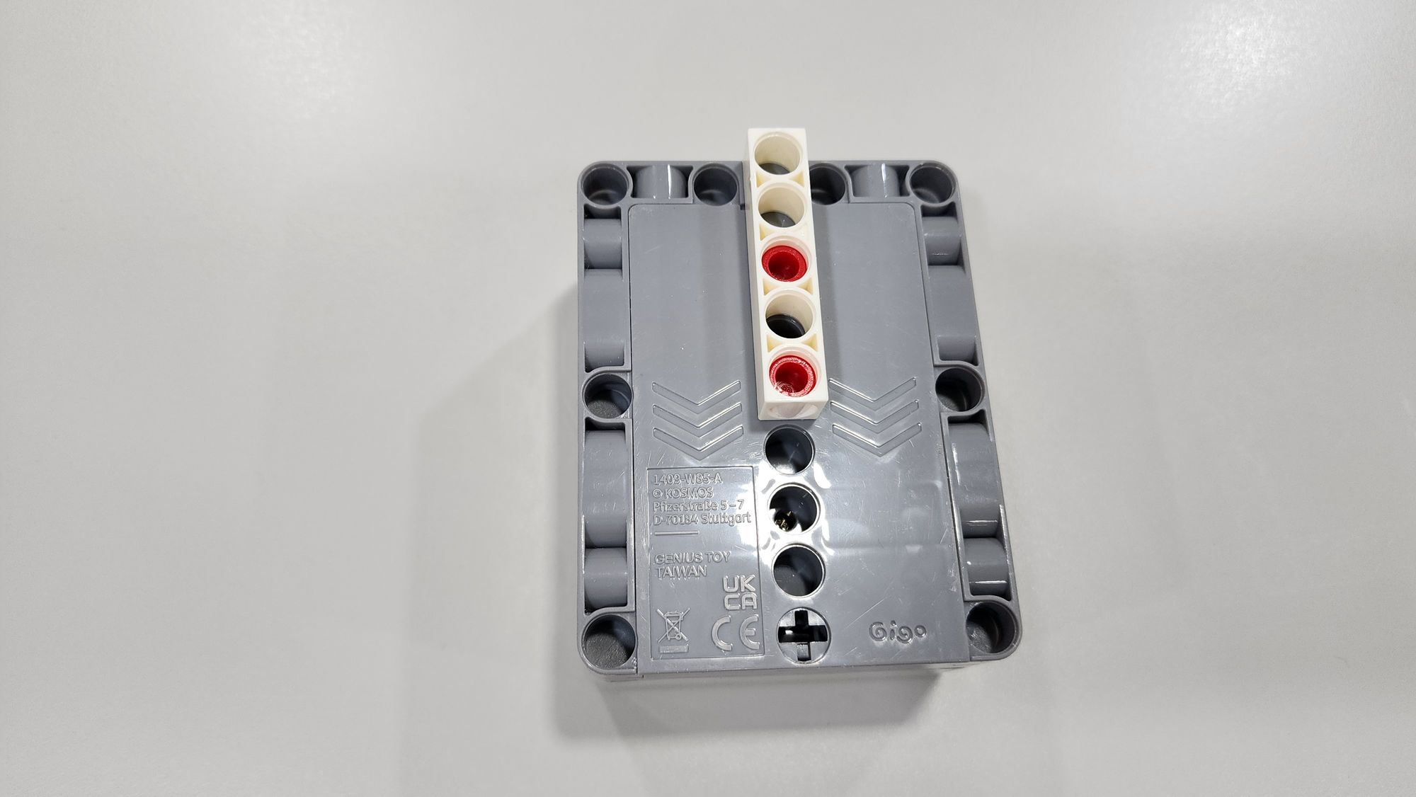 第二步我們要來安裝micro:bit 智能主控盒,需要使用到micro:bit 智能主控盒、5孔超條以及長結合鍵(圖四),依照圖示將他們安裝在一起(圖五)。