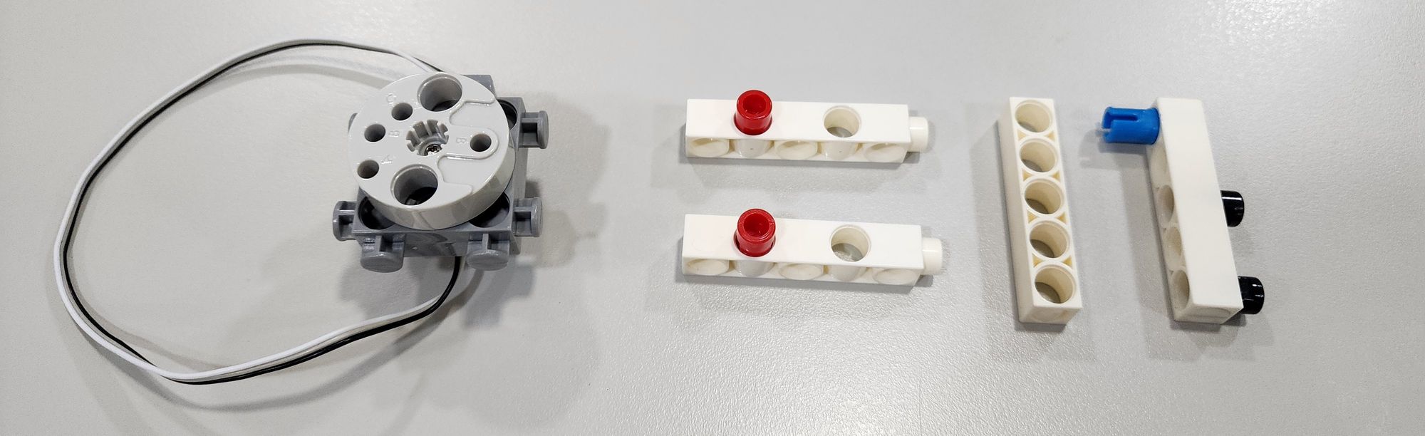 第一步我們要製作出車體的結構,需要使用到50倍行星齒輪馬達盒、3孔超長條、20T齒輪、27mm馬達短軸、3x13孔超長方框以及長結合鍵(圖一),並依照圖示將他們安裝在一起(圖二)。