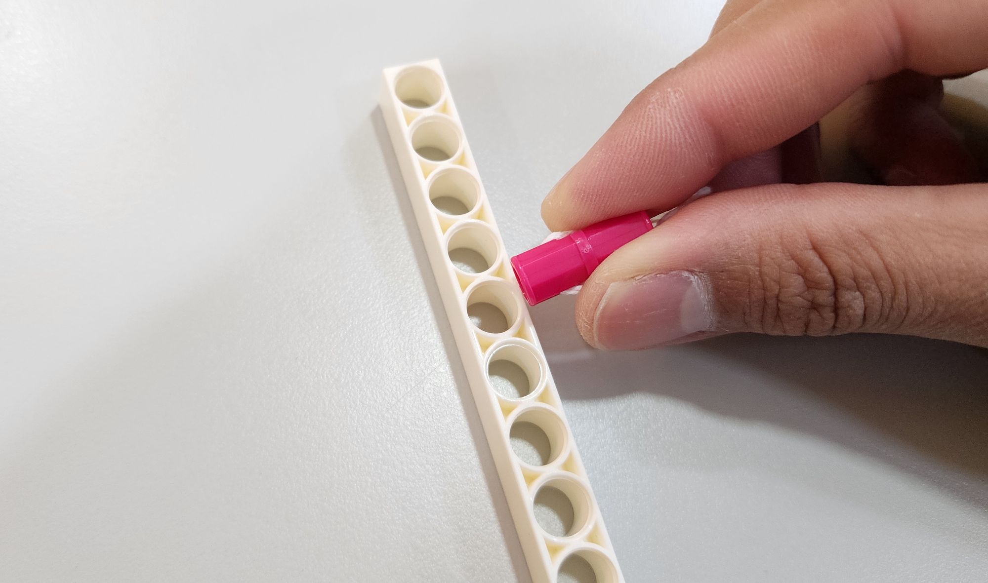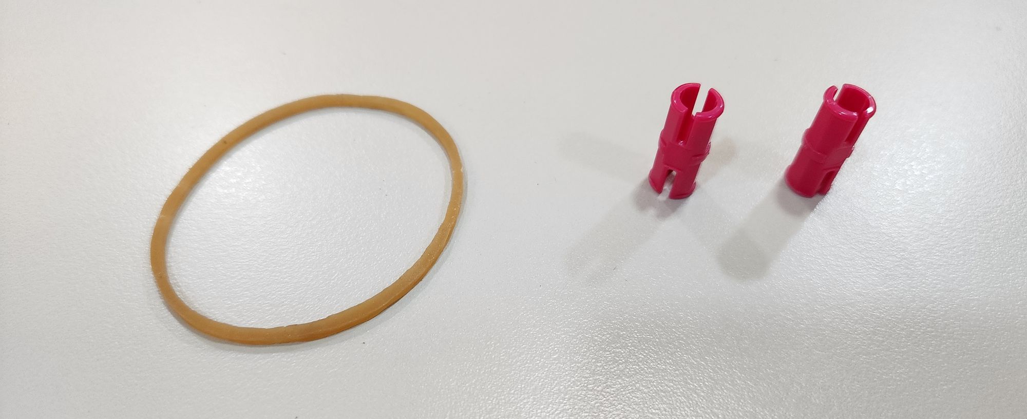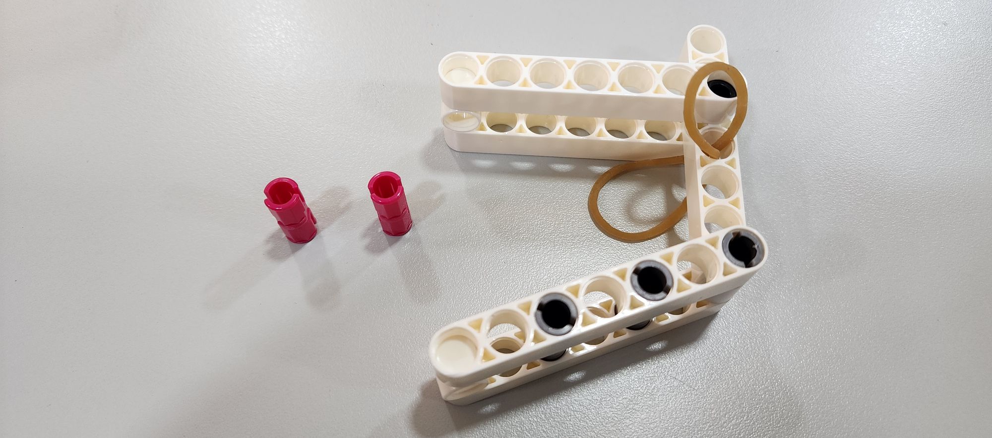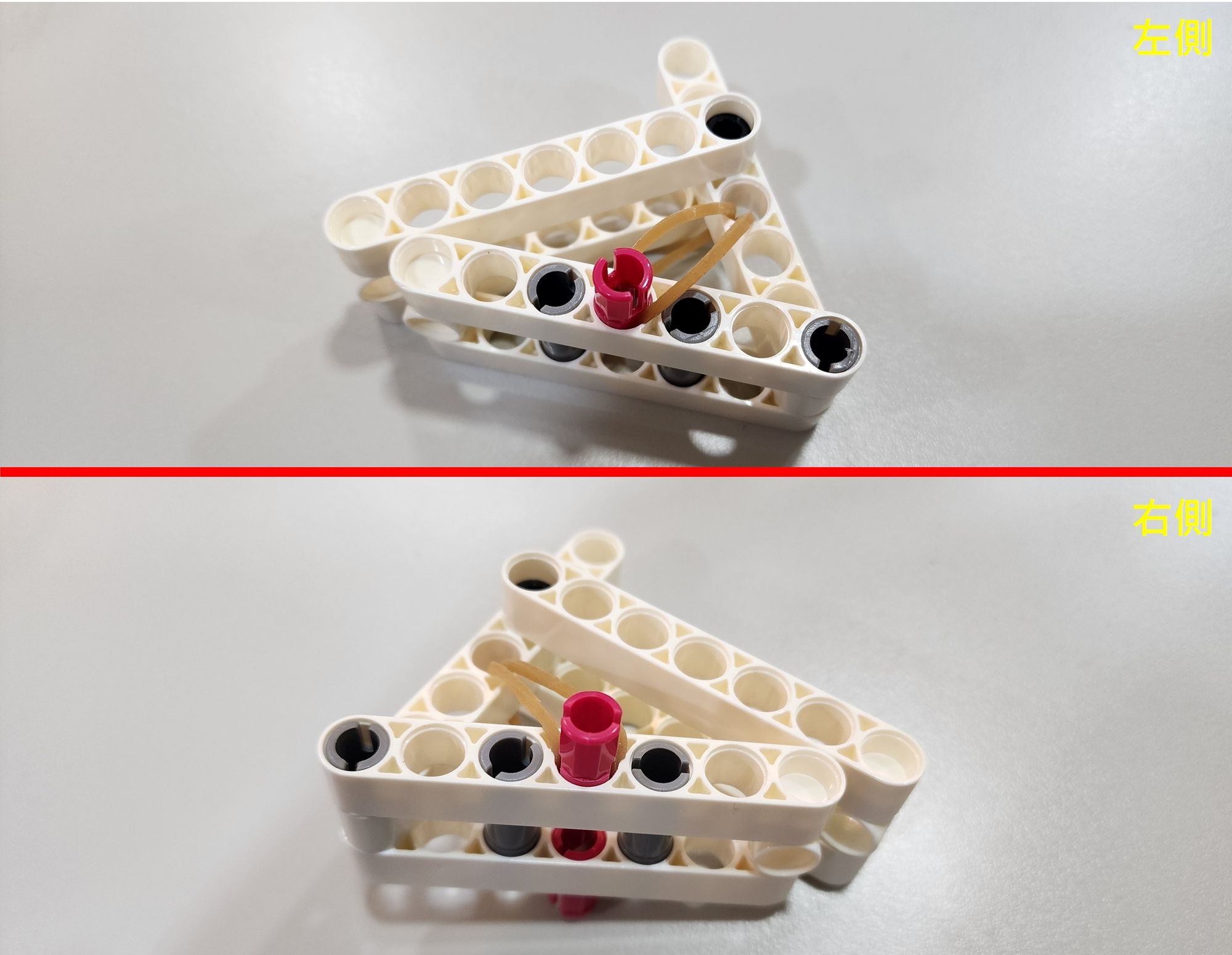 第三步我們要來安裝橡皮筋,需要使用到橡皮筋以及栓扣鍵(圖六),首先將橡皮筋穿過做為軀幹的7孔圓角長條(圖七),接著使用栓扣鍵將橡皮筋固定在足部的左右兩側(圖八)。