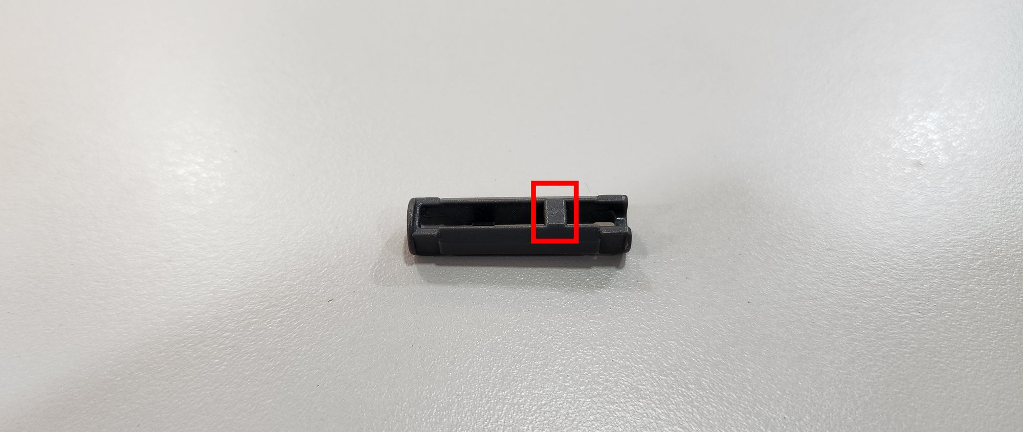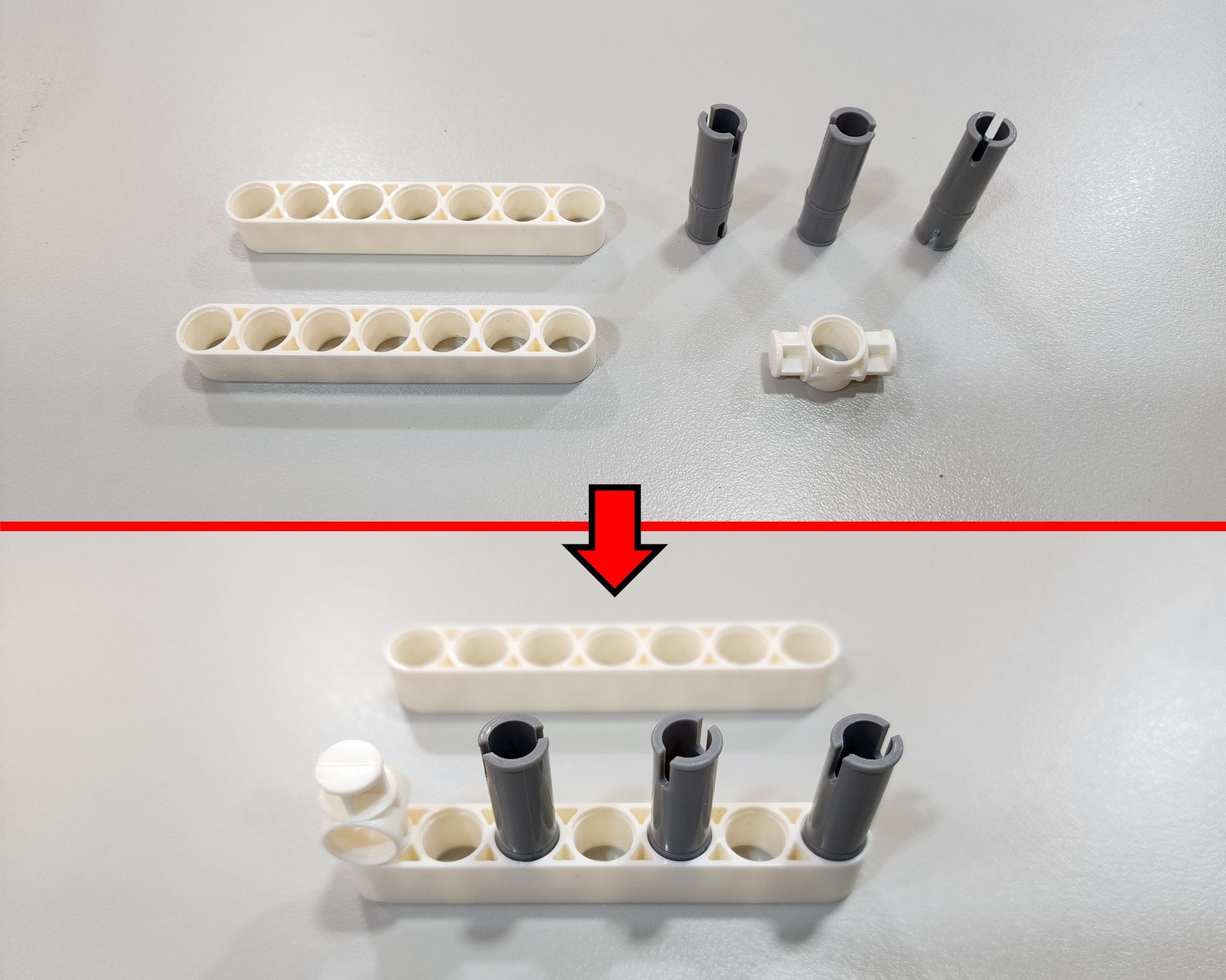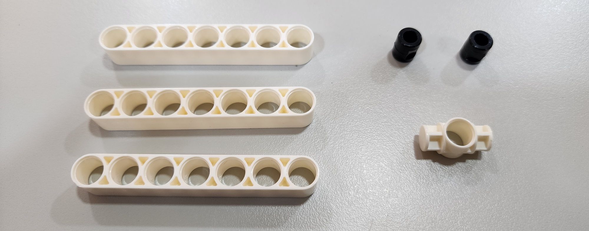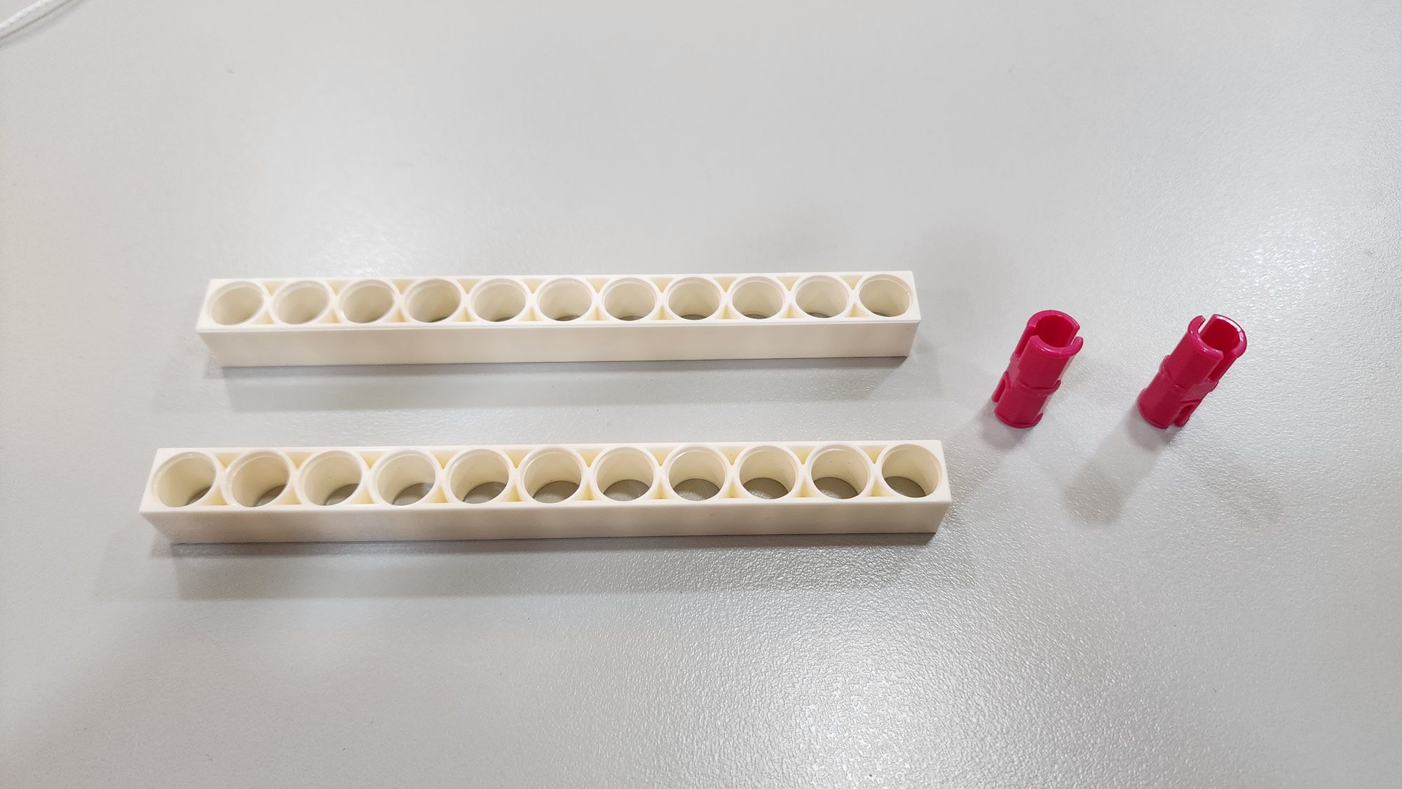 第三步我們要來安裝橡皮筋,需要使用到橡皮筋以及栓扣鍵(圖六),首先將橡皮筋穿過做為軀幹的7孔圓角長條(圖七),接著使用栓扣鍵將橡皮筋固定在足部的左右兩側(圖八)。