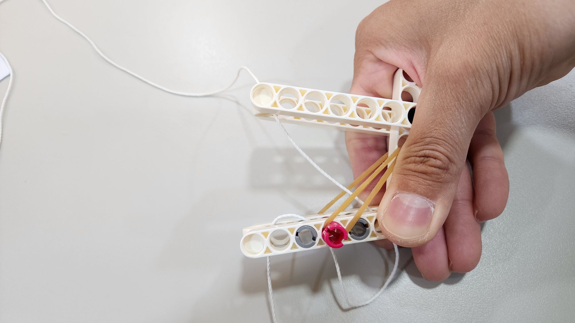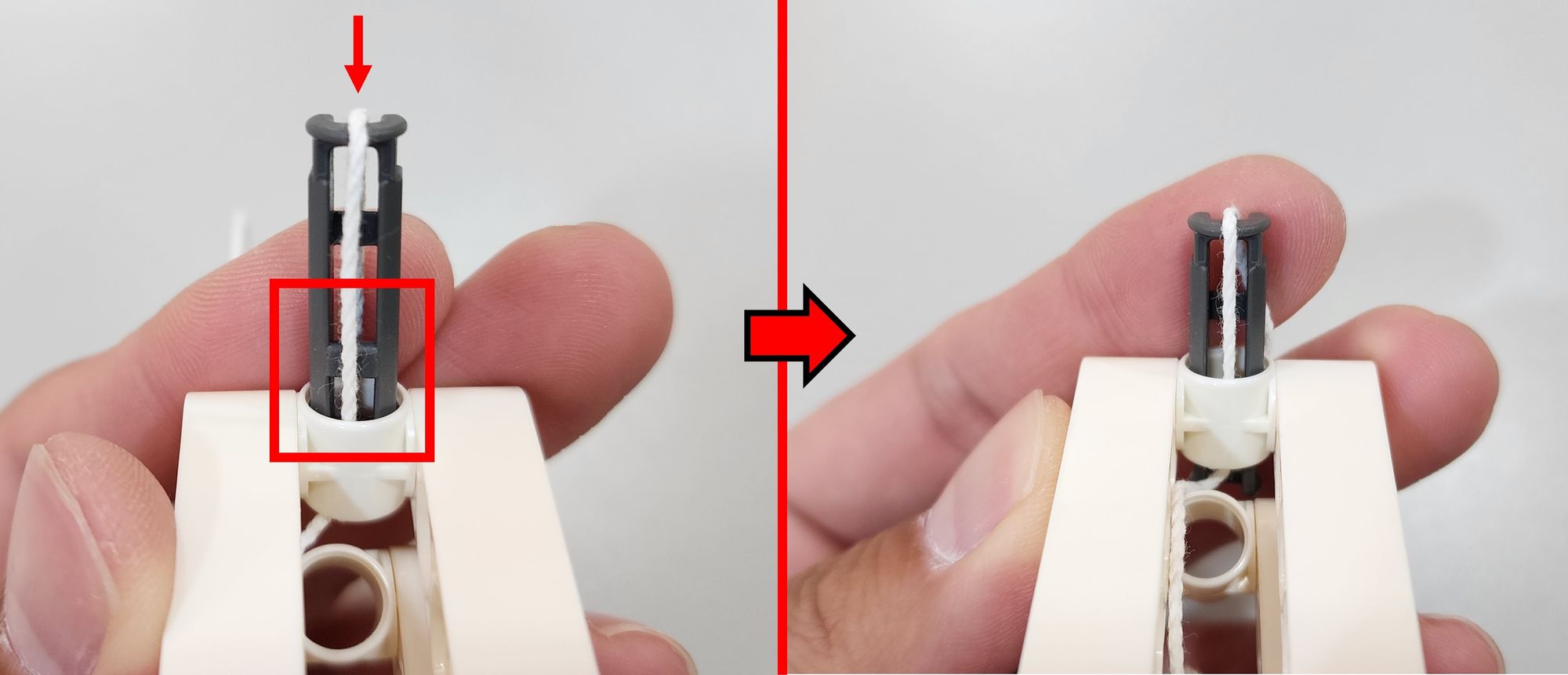 第四步我們要來穿入棉繩,可以使用一般市售的棉繩或是智高套組內附的特多龍線(圖九),首先將棉繩由上而下穿入手部中央的2凸單孔轉向結合器(圖十)。