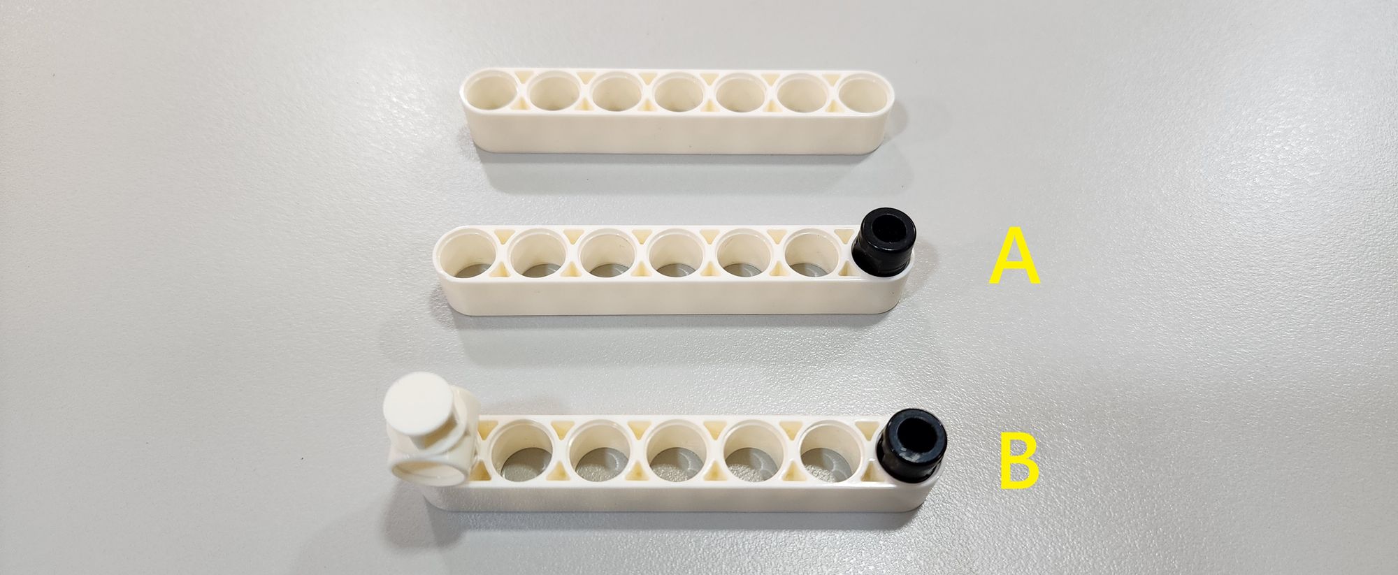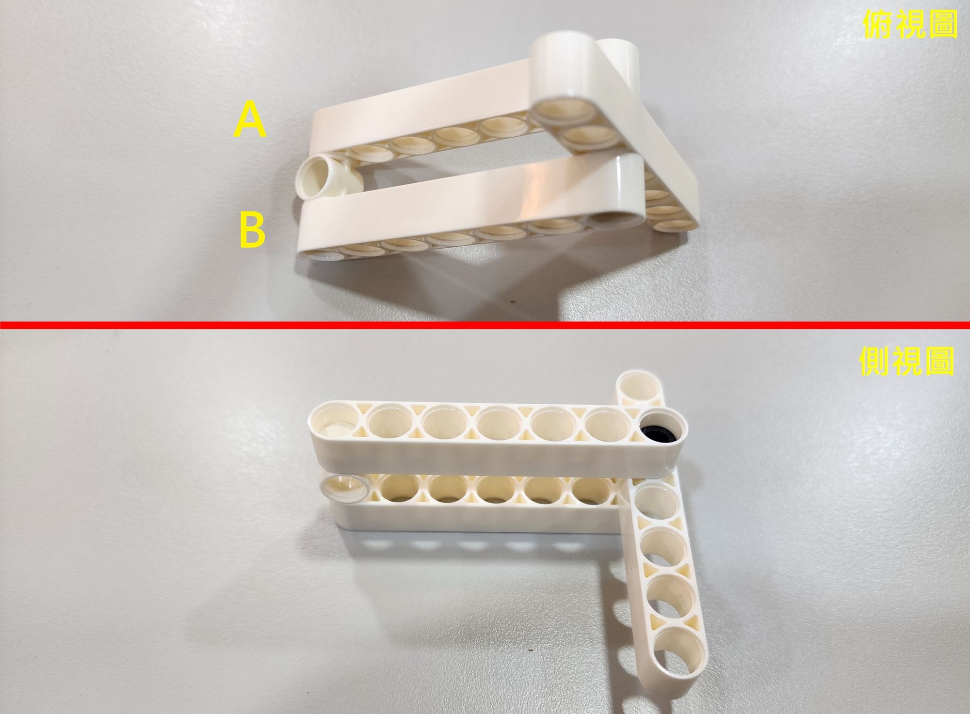 第一步我們要製作小猴子的手部和軀幹,需要使用到7孔圓角長條、2凸單孔轉向結合器以及短結合鍵(圖一),並依照圖示將他們組裝成部件A與部件B(圖二)。